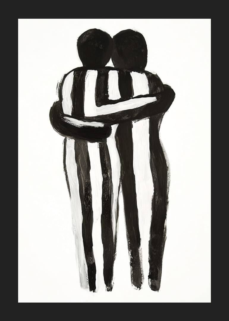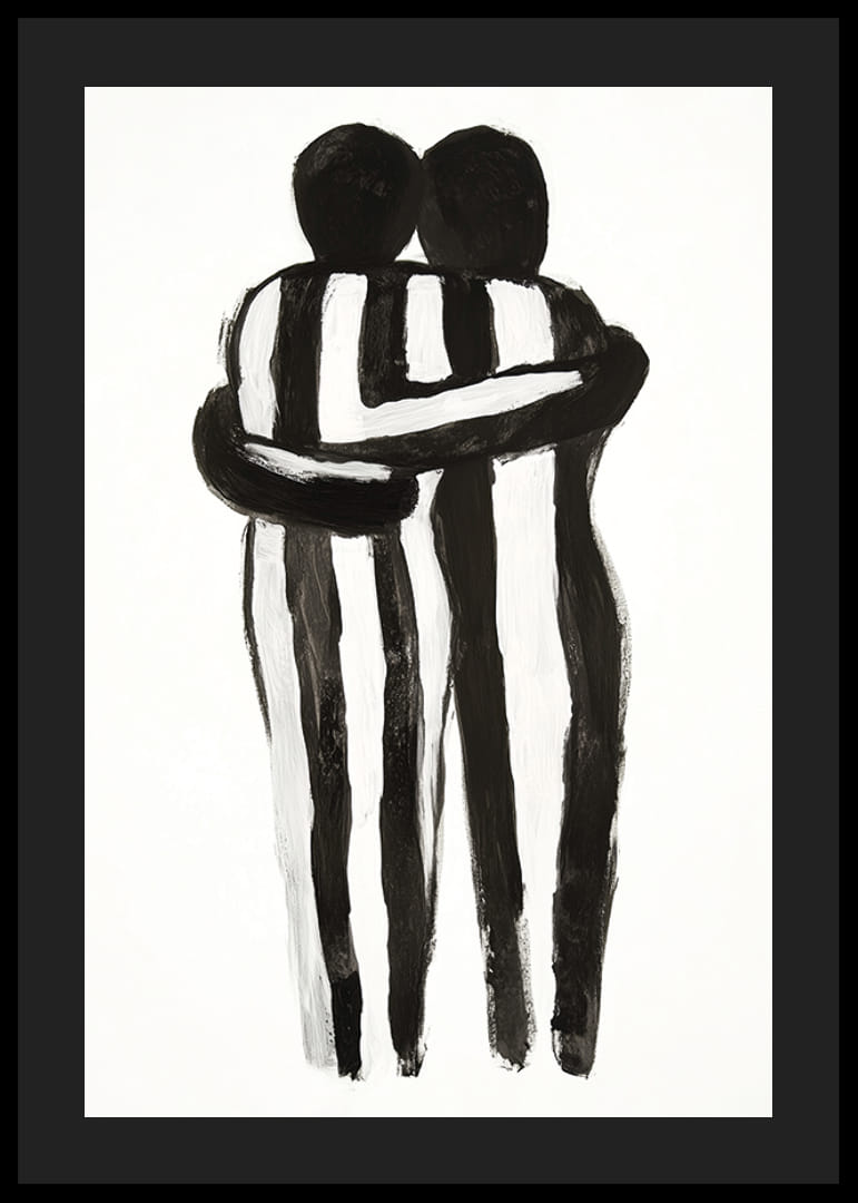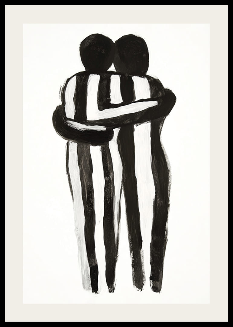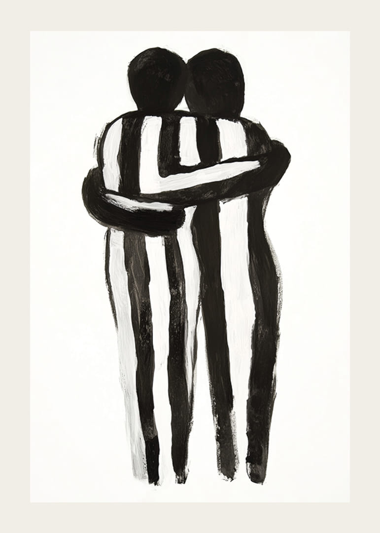 Cette affiche capture l’essence de la solidarité humaine à travers une représentation monochrome de deux personnes dans une étreinte. Les lignes noires et blanches créent un équilibre entre les contrastes et transmettent un sentiment de calme et d’unité.