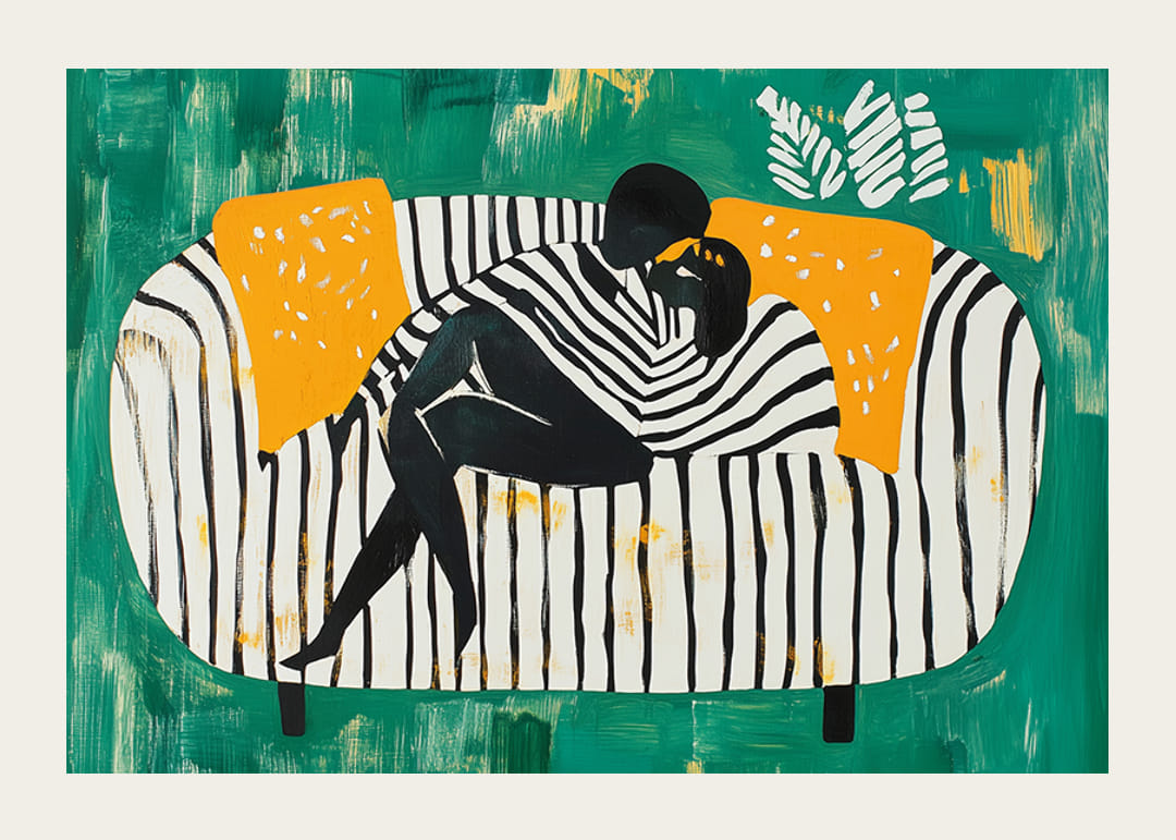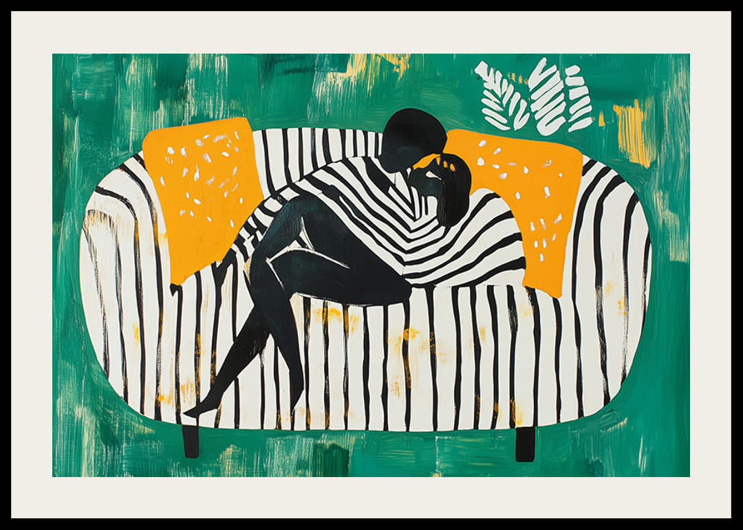 Cette affiche capture une étreinte amoureuse dans une expression abstraite et colorée. Sur un fond vert profond, les rayures graphiques s'associent à des détails orange vibrants, créant un sentiment d'harmonie et de proximité.
