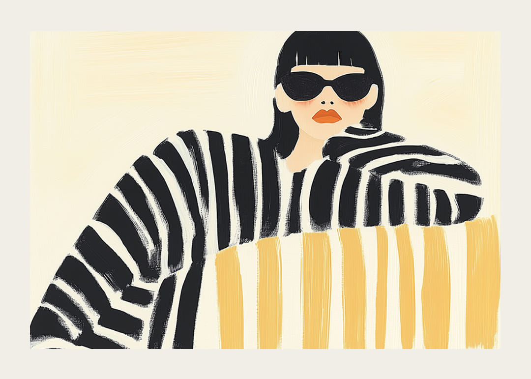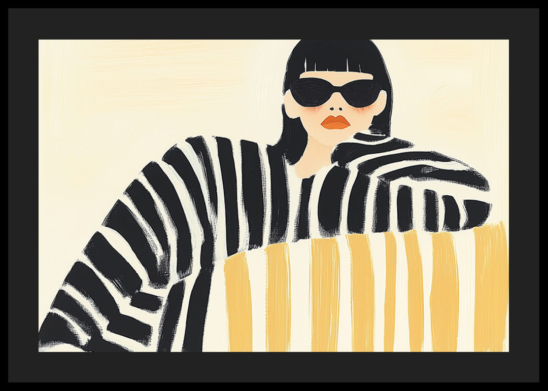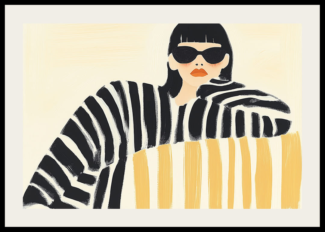 Cette affiche attire le regard par son style audacieux et moderne, où une figure mystérieuse porte de grandes lunettes de soleil et une chemise rayée en noir et blanc. Les rayures vibrantes sont combinées à des lignes élégantes, créant un sentiment d'élégance sophistiquée.