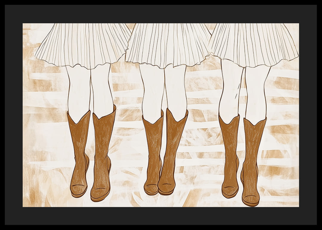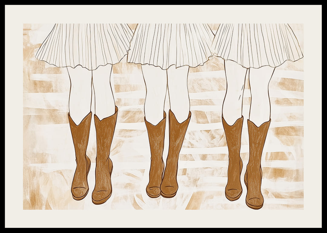 Cette affiche capture l'élégance simple de trois paires de bottes élégantes dans un mouvement parfaitement synchronisé. Les tons doux et terreux transmettent un sentiment chaleureux de tradition et de communauté, tout en représentant une beauté subtile dans les contrastes entre les plis des robes et la forme robuste des bottes.