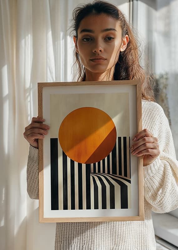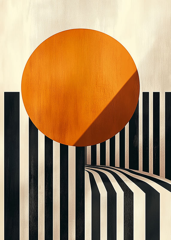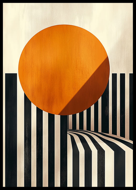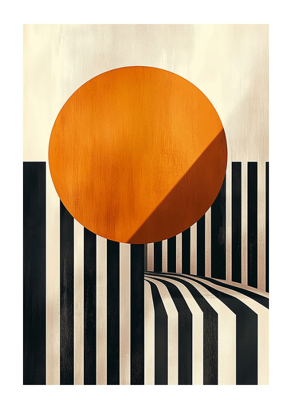 Découvrez une affiche où des lignes noires et blanches contrastées s'harmonisent avec un cercle orange rayonnant qui semble flotter au premier plan. Le mouvement ample des lignes crée une sensation hypnotique de profondeur et de dimension, et la combinaison de couleurs donne à la pièce à la fois énergie et chaleur.