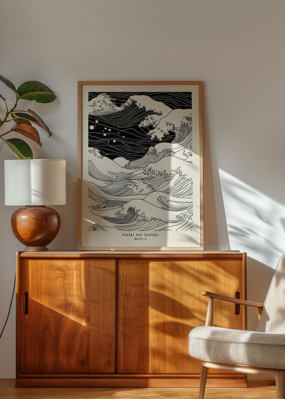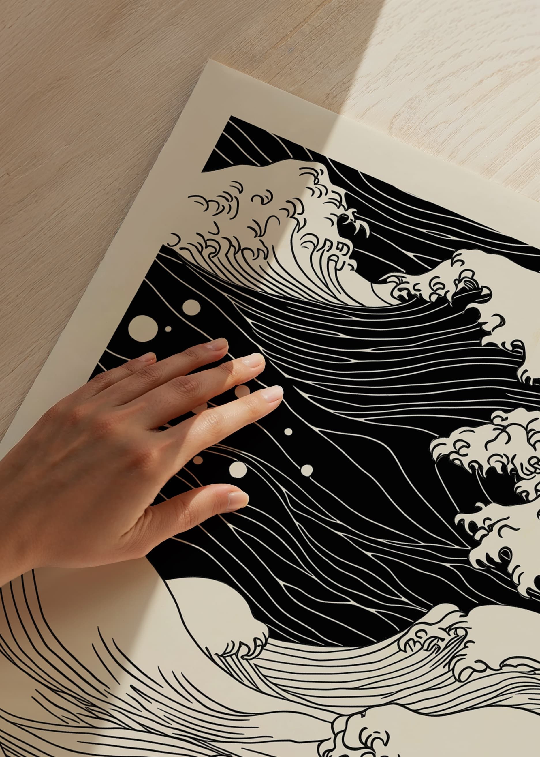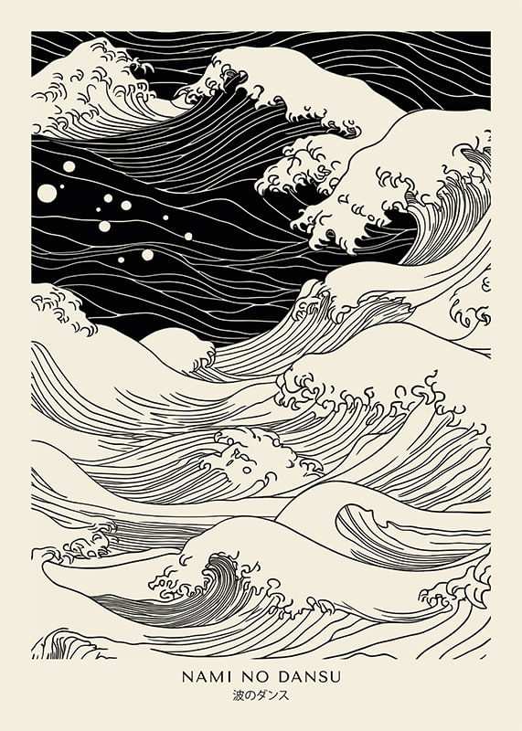 Les vagues rythmiques de cette superbe affiche capturent la danse éternelle et la force de l'océan. Avec des lignes noires audacieuses et des formes amples, ils créent un mouvement hypnotique qui respire la puissance calme. L'affiche transmet un sentiment d'intemporalité et transforme n'importe quelle pièce en une oasis harmonieuse où les histoires de la mer sont murmurées dans le vent.