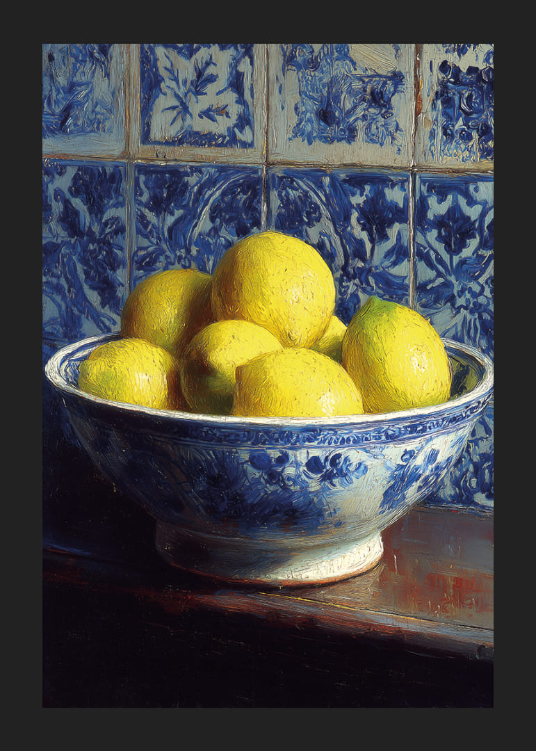 Cette affiche attire le regard avec ses citrons éclatants disposés dans un élégant bol bleu et blanc, mis en valeur par un mur carrelé. La céramique, à la fois robuste et élégante, accentue la fraîcheur jaune des citrons, créant une ambiance harmonieuse et équilibrée. Cette affiche sublimera l'atmosphère de toute cuisine ou salle à manger en y ajoutant une touche de style classique et la simplicité pure de la nature.