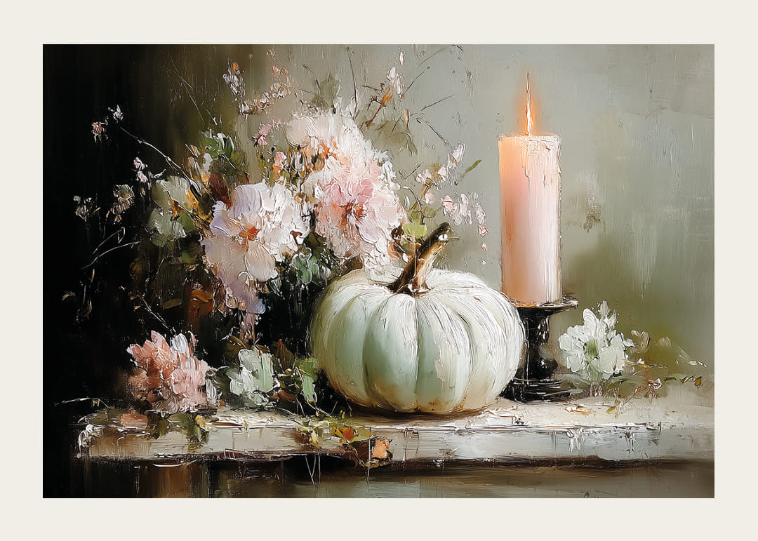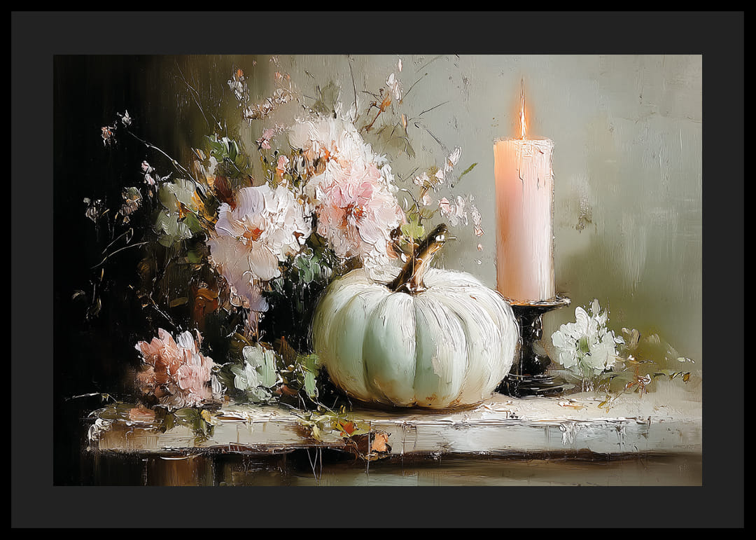 Cette affiche capture une scène onirique où des fleurs délicates et une bougie allumée créent une atmosphère paisible et sereine. Les tons agréables des couleurs s'harmonisent harmonieusement avec l'élégante citrouille et les fleurs. Cette affiche crée une atmosphère harmonieuse, idéale pour une pièce où vous recherchez calme et beauté méditative. Elle apporte une atmosphère douce et accueillante à votre intérieur.