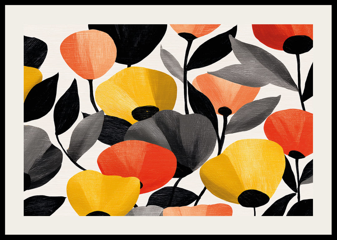 Cette affiche attire le regard par son motif floral coloré où les nuances de jaune, d'orange et de rouge se détachent sur un fond blanc. Les feuilles aux nuances de gris créent un contraste profond qui rehausse l'éclat de la fleur. L'affiche dégage une impression d'énergie et de joie qui se répand dans toute la pièce. Idéale pour égayer n'importe quel espace, elle apporte une touche de fraîcheur et de modernité.
