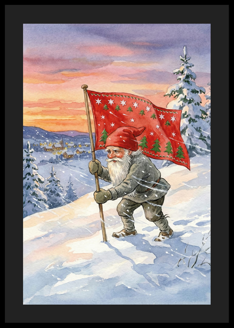 Cette affiche capture un monde hivernal féerique où un elfe porte fièrement un drapeau orné d'étoiles et de sapins. Le ciel dramatique, peint dans des tons chauds de rose et d'orange, crée un magnifique contraste avec le paysage blanc et froid de la neige. Cette affiche insuffle un sentiment de tradition et de mystère, conférant à n'importe quelle pièce une atmosphère chaleureuse et féerique.