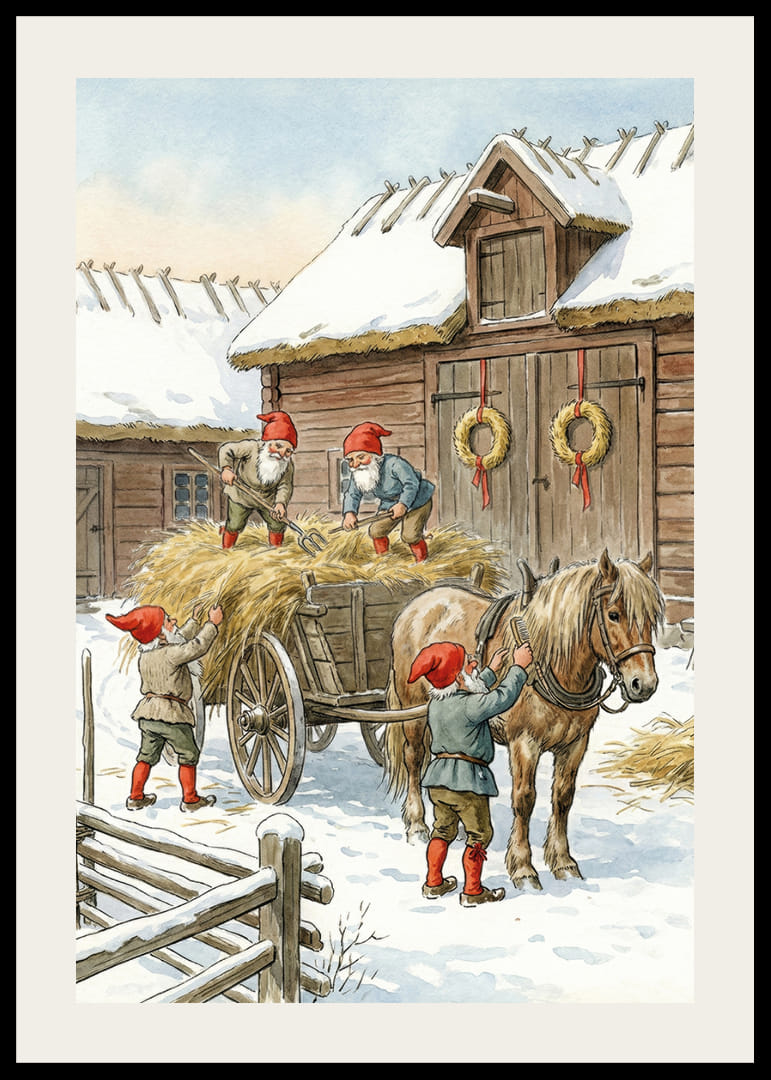 Dans une ambiance féérique hivernale, de petits lutins rouges se rassemblent devant une grange rustique, entourés de neige scintillante et de couronnes de paille. Cette affiche capture la magie de Noël, où chaque détail respire la convivialité et la tradition. Avec ses tons chauds et naturels et ses motifs ludiques, elle crée une atmosphère chaleureuse, idéale pour transformer votre maison en un havre de magie et de joie hivernales.