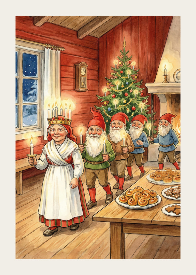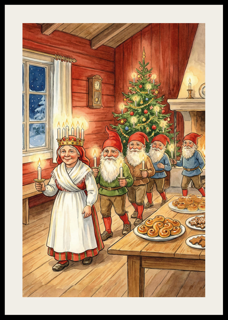 Cette affiche capture la magie d'un réveillon de Noël nordique : Lucia, entourée de ses lutins, traverse une pièce chaleureuse imprégnée de l'esprit de Noël. La douce lueur du feu danse en arrière-plan tandis que le sapin illumine la pièce de ses lumières scintillantes. L'atmosphère est accueillante et joyeuse. Cette affiche transforme n'importe quel foyer en un lieu où tradition et festivités se rencontrent, emplissant la pièce du charme et de la chaleur nordiques.