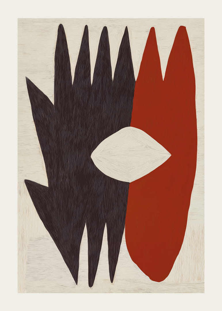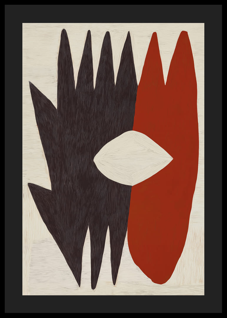 Cette affiche attire le regard par ses formes géométriques modernes et l'association percutante du rouge et du noir. L'œil blanc central crée un point focal qui confère à la composition une impression d'équilibre et d'harmonie. L'affiche apporte une touche d'audace et de dynamisme artistique à toute pièce, ce qui la rend idéale pour les intérieurs modernes et minimalistes.
