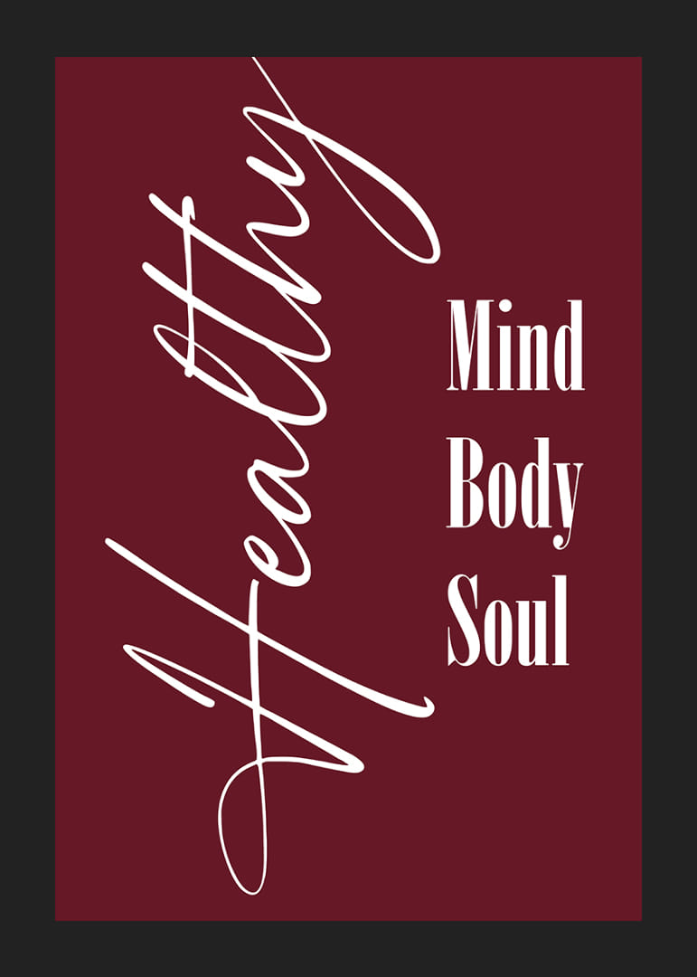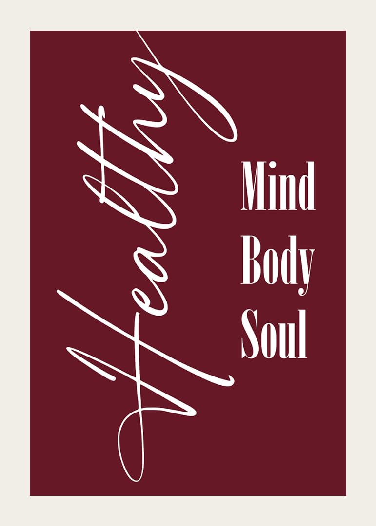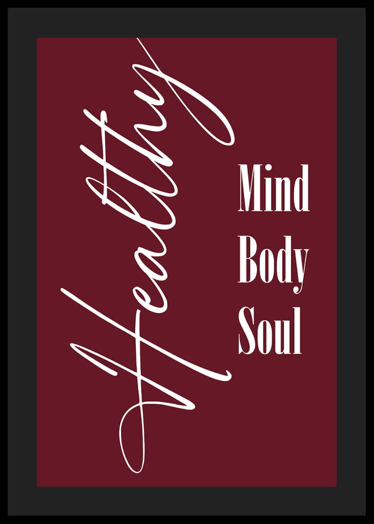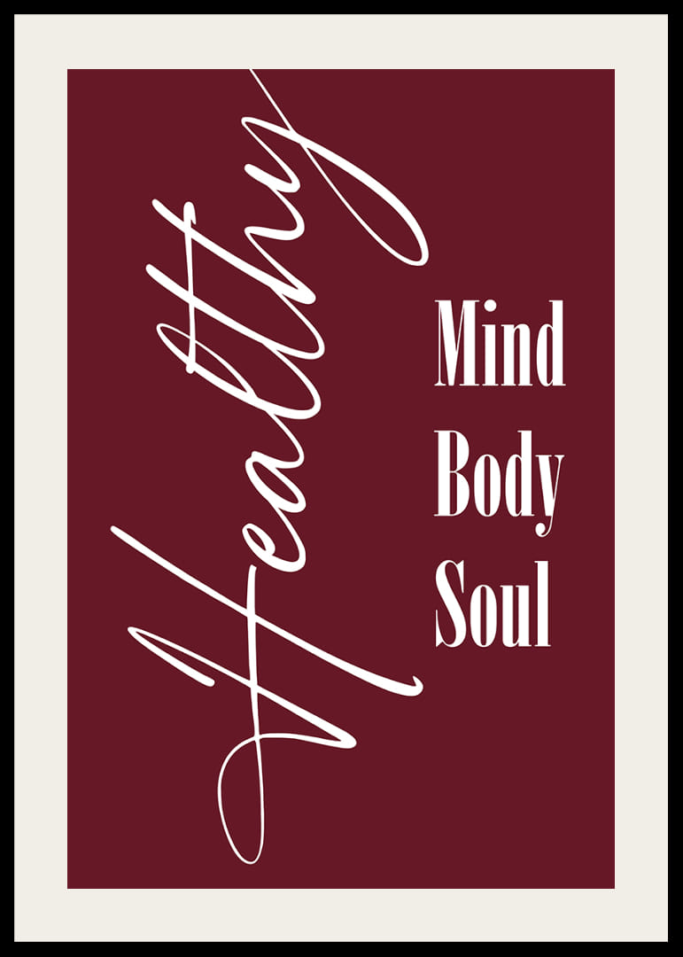 Cette affiche attire immédiatement le regard par son design élégant et sa riche palette de couleurs. Arborant la devise « Esprit, Corps, Âme » en typographie classique sur un fond rouge profond, elle souligne l'importance de l'équilibre et du bien-être holistiques. Une affiche qui non seulement invite à la réflexion, mais qui, par sa simplicité esthétique et la profondeur de son message, embellit également l'atmosphère de toute pièce.