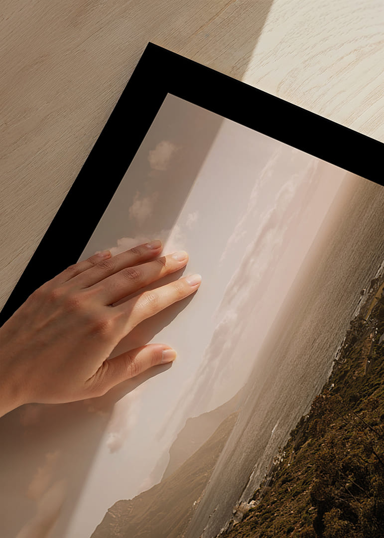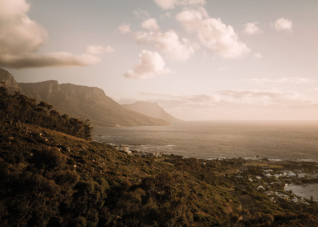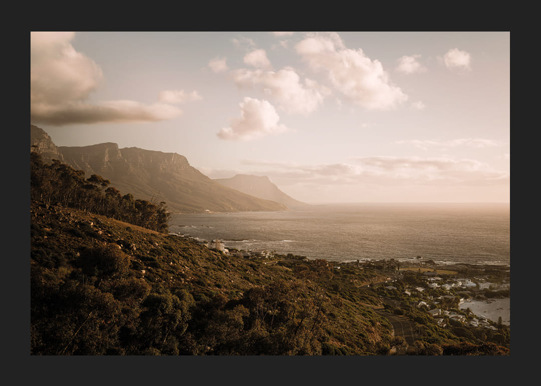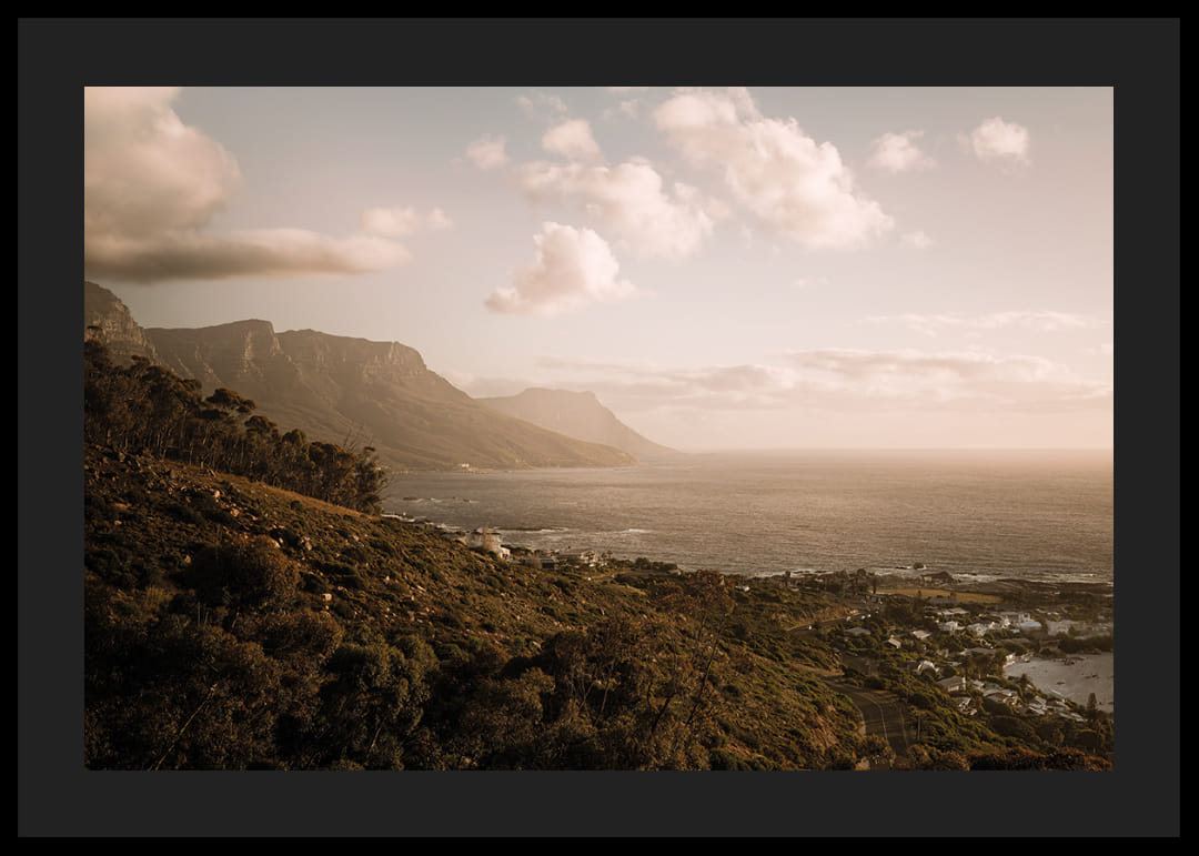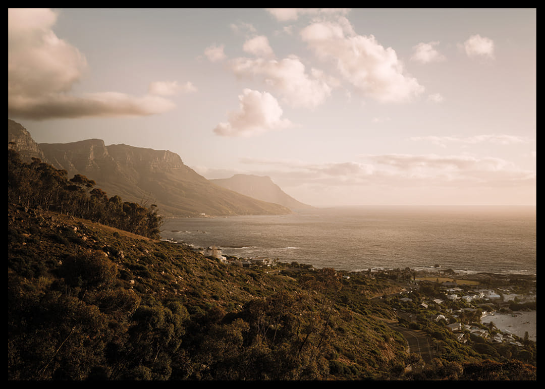 Un vaste paysage côtier le long de la péninsule du Cap, où les montagnes rencontrent l'Atlantique sous une douce lumière dorée du soir. La mer s'étend jusqu'à l'horizon et les maisons en contrebas se fondent dans le paysage. Une affiche apaisante qui capture l'espace, la liberté et la présence – une image qui invite le calme à s'installer durablement.
