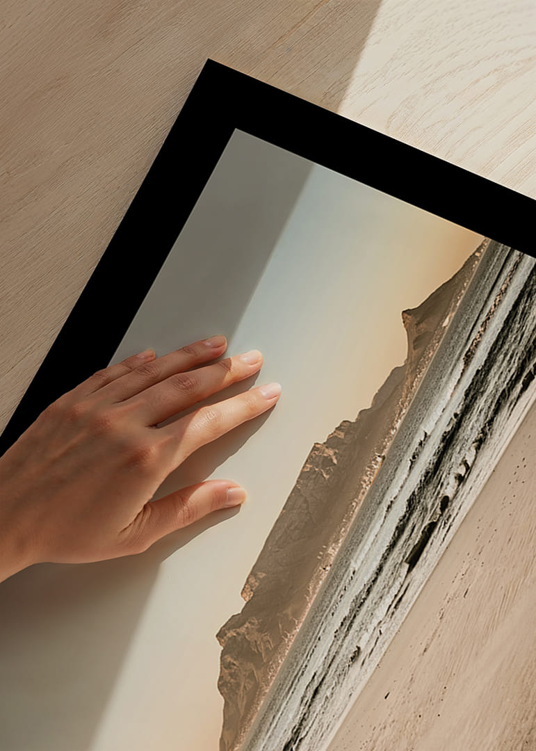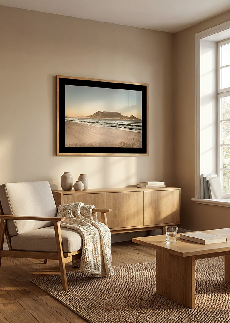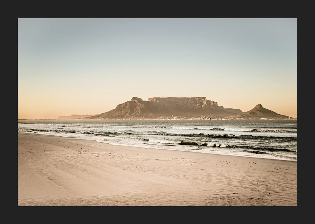 La Montagne de la Table se dresse au loin, visible depuis la plage où les vagues caressent le sable fin. La lumière est chaude et tamisée, le ciel immense et immobile – un panorama où l'agitation de la ville semble bien loin. Une affiche intemporelle qui capture la silhouette emblématique du Cap avec une sérénité apaisante et une impression d'espace épurée.