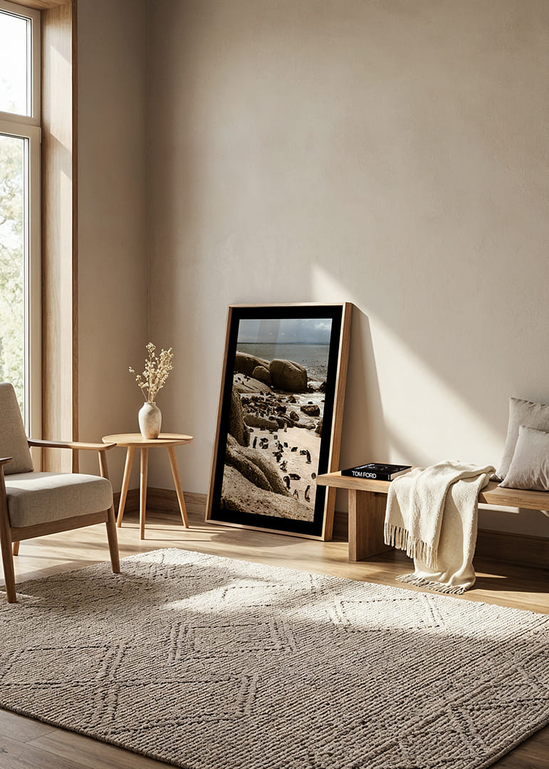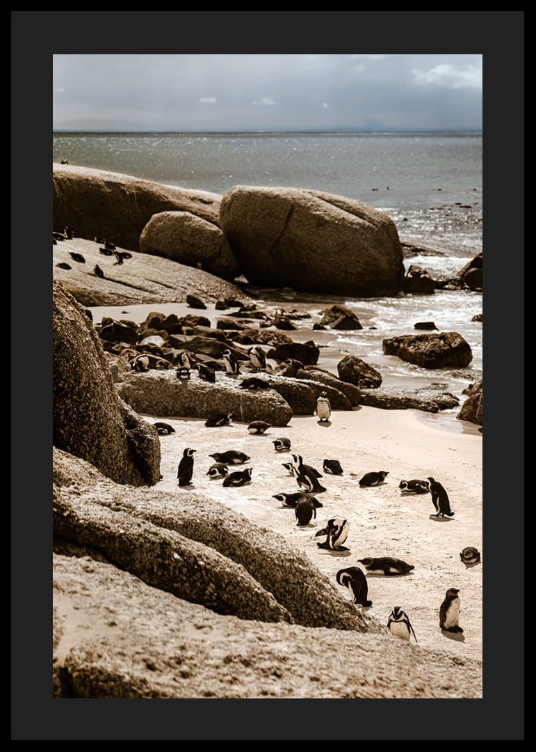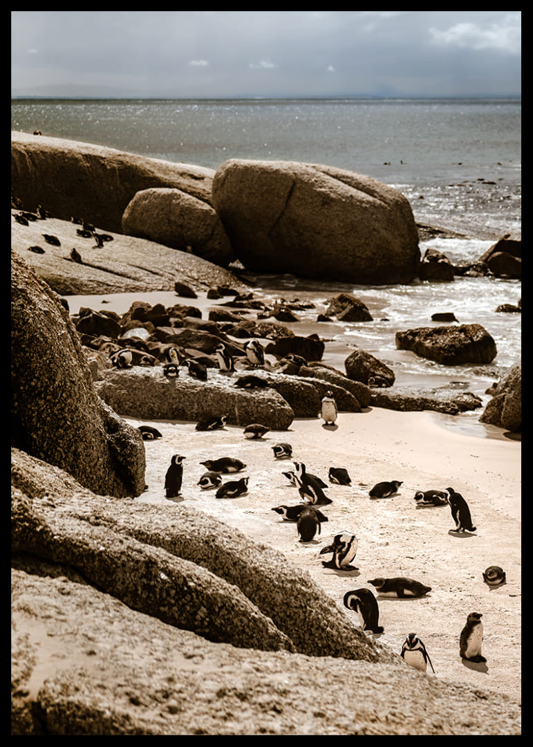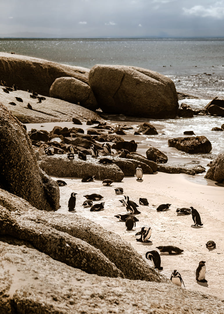 Une scène côtière vibrante de Boulders Beach, où des manchots du Cap évoluent entre le sable chaud, les falaises arrondies et la mer scintillante. L'image saisit un instant du quotidien, au rythme de la nature, dans une palette de couleurs douces et une atmosphère paisible.