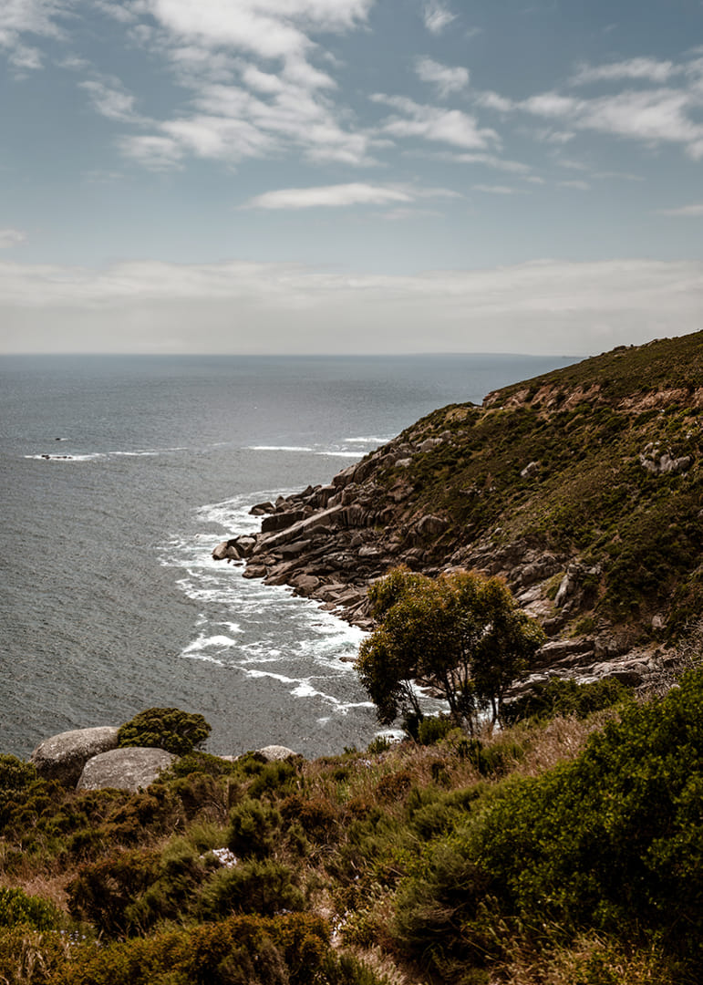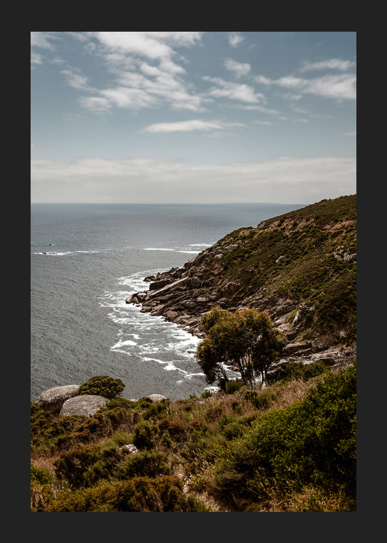 Un magnifique paysage côtier le long de la spectaculaire péninsule du Cap, où l'immensité de l'Atlantique rencontre les falaises, la verdure et les courbes sculptées par le vent. L'horizon se perd au loin et les vagues se brisent doucement sur le rivage dans un rythme paisible. Une affiche qui capture la présence et l'immensité de la nature.