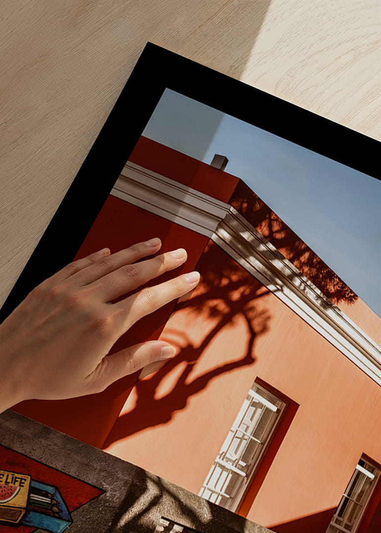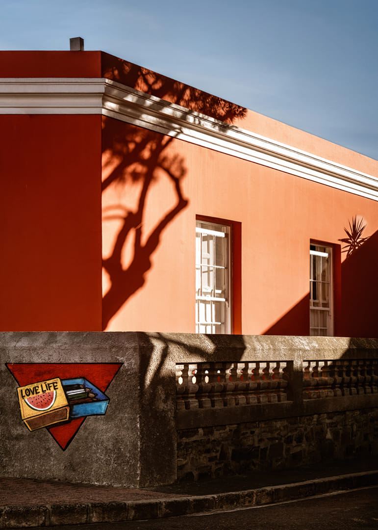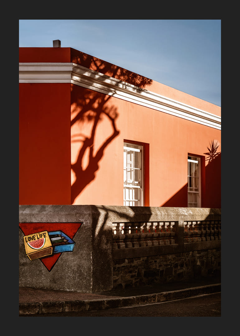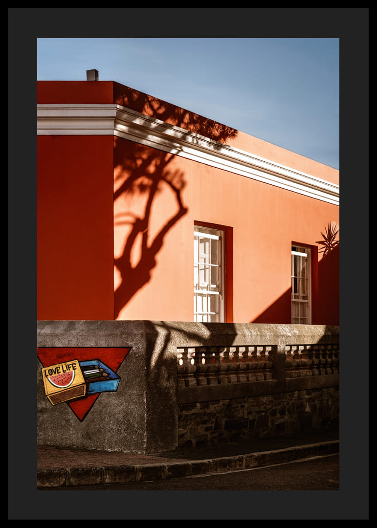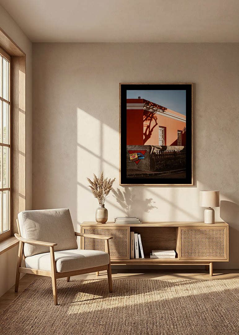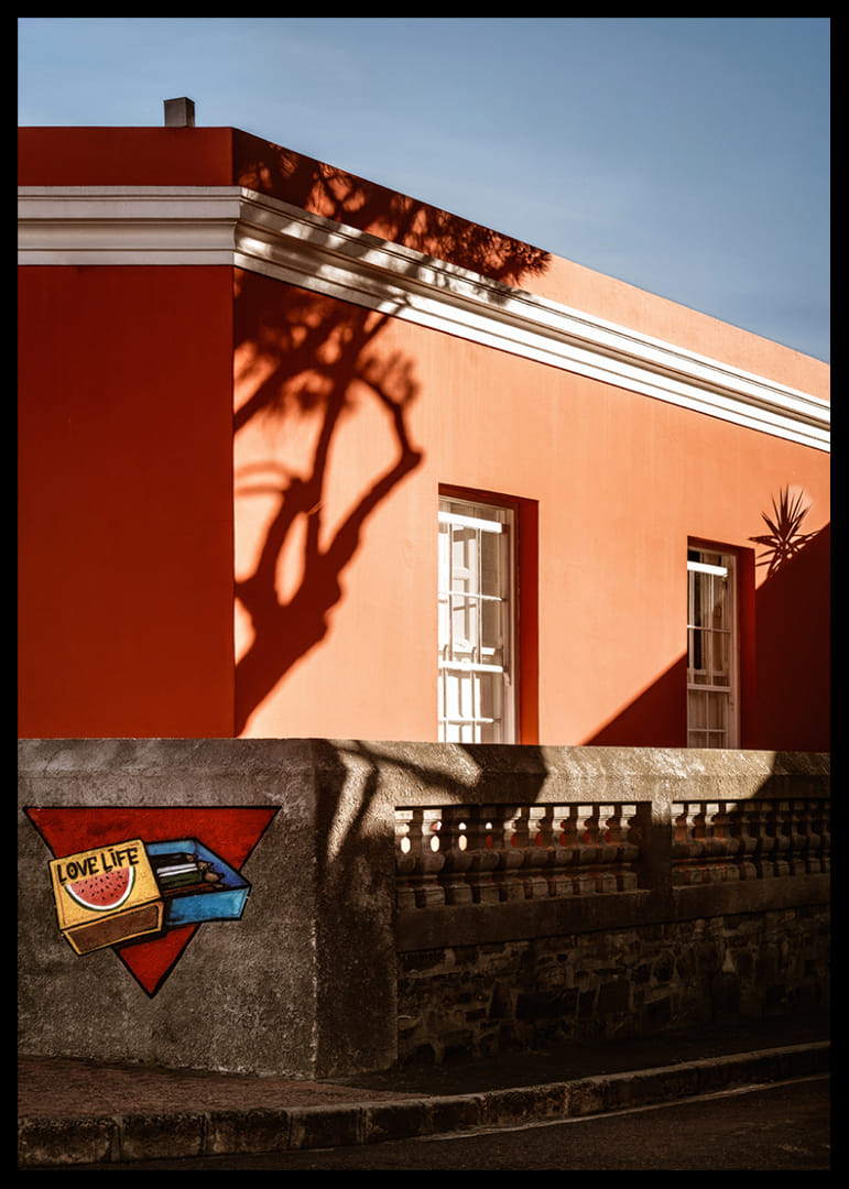 Une scène chaleureuse et graphique de Bo-Kaap où une façade corail se heurte aux ombres nettes du soleil couchant. La lumière caresse les surfaces, créant un instant de quiétude empreint de couleurs, de formes et d'une poésie du quotidien. Une affiche qui restitue le charme et l'authenticité de la ville.