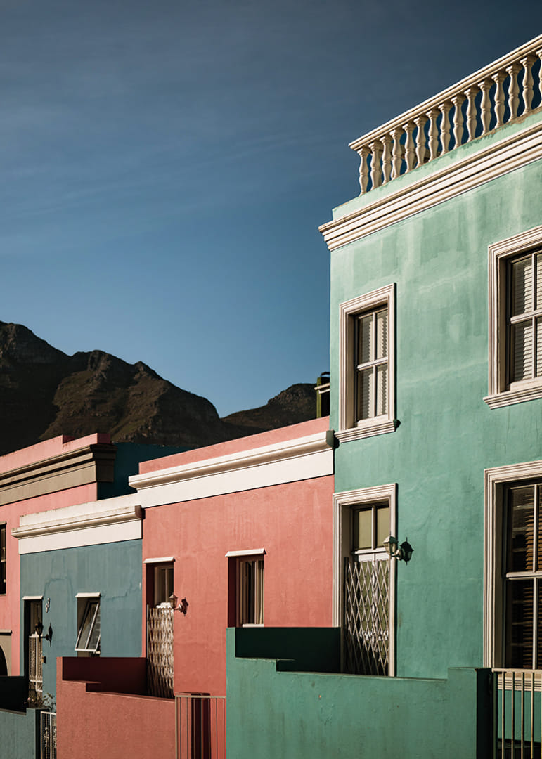 Vue harmonieuse depuis Bo-Kaap, où les façades aux teintes pastel turquoise, rose et bleu forment un jeu graphique de lumière et de lignes. À l'arrière-plan, les montagnes se dressent, offrant au sujet un contraste saisissant avec le paysage urbain.