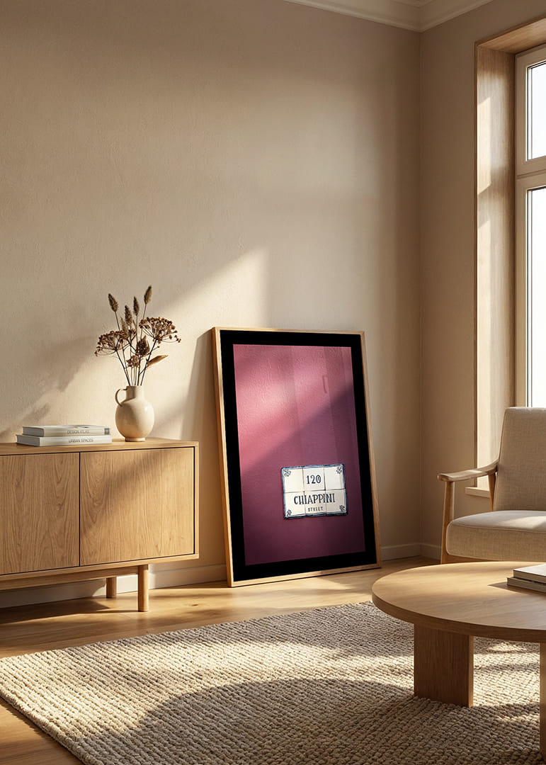 Détail caractéristique du quartier de Bo-Kaap au Cap, où un panneau de rue peint à la main contraste avec une façade aux magnifiques teintes pastel. La lumière crée des ombres subtiles qui confèrent à l'image profondeur, sérénité et équilibre graphique.