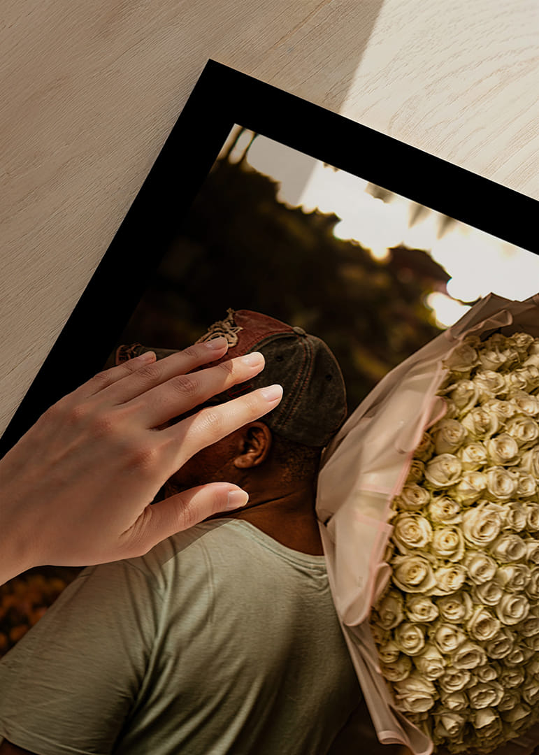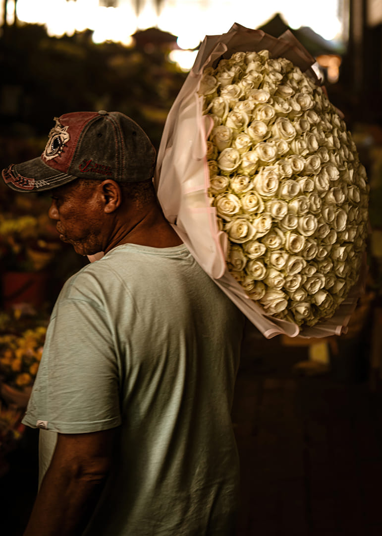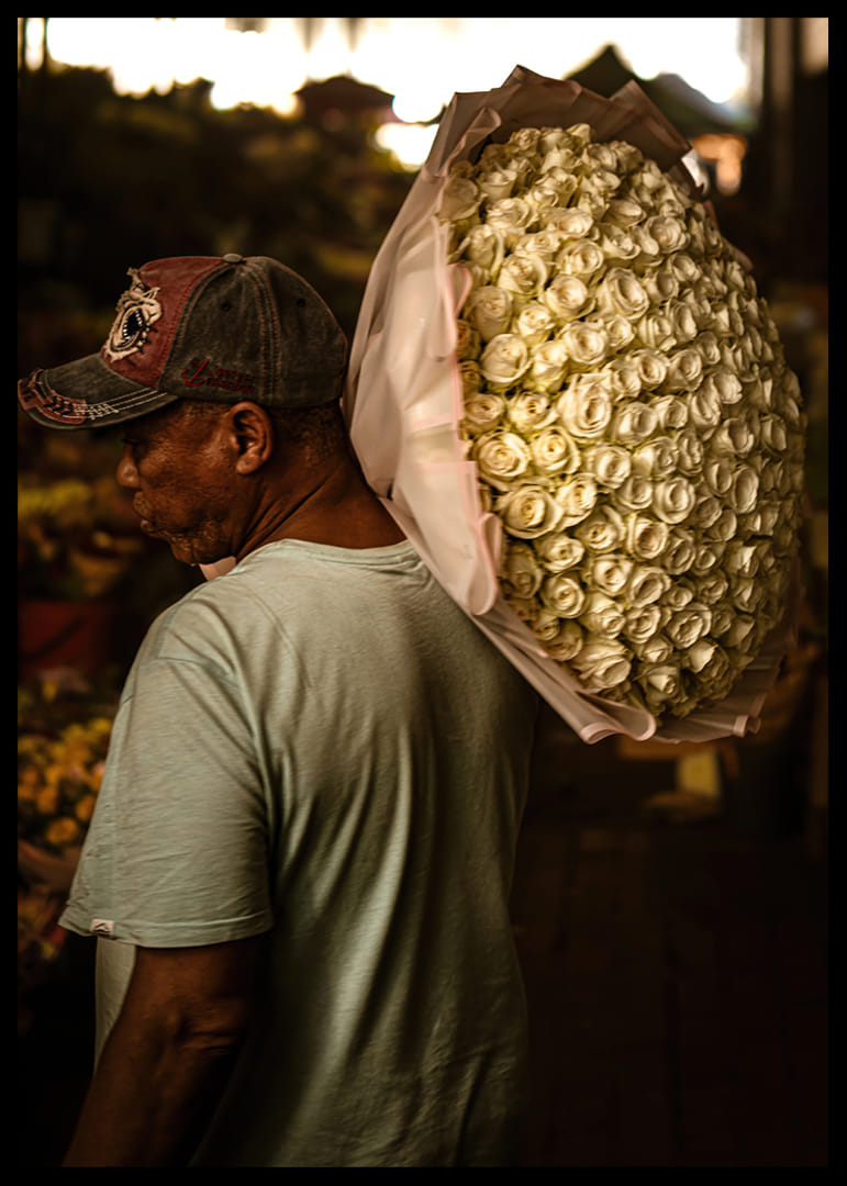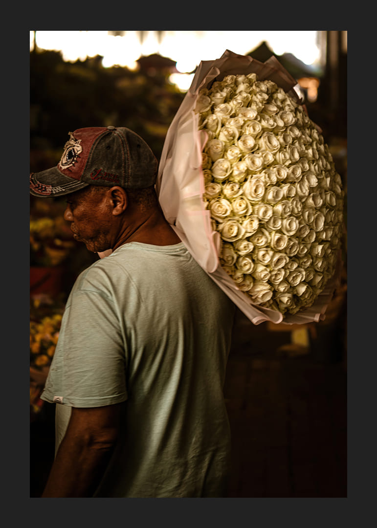 Une scène saisissante du marché aux fleurs d'Adderley Street : un homme porte un immense bouquet de roses blanches sur son épaule, au milieu de l'effervescence du marché. Le contraste entre la simplicité et la puissance de l'ensemble crée une image empreinte de présence et de tradition. La lumière douce et tamisée confère au sujet une profondeur particulière.