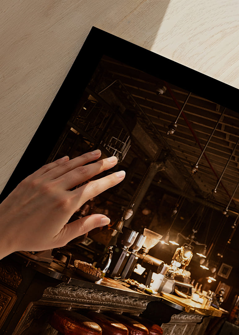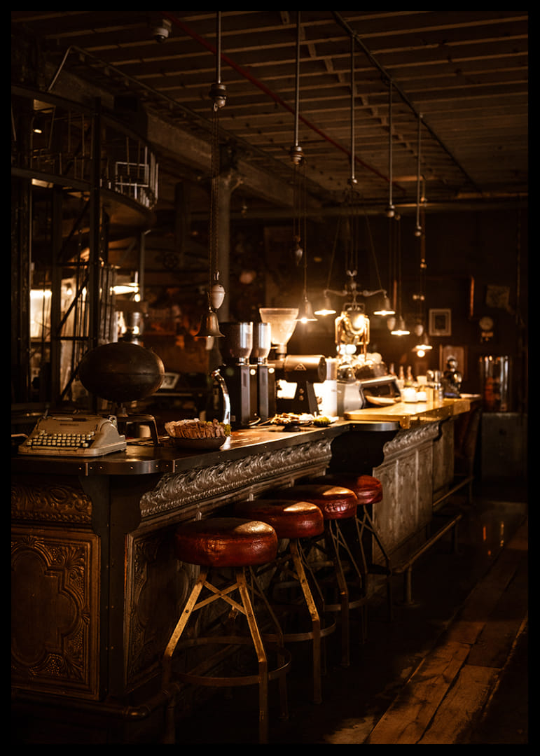 Une photographie d'ambiance prise chez TRUTH Coffee Roasting, où la brutalité industrielle côtoie une élégance chaleureuse dans une lumière tamisée. Le long comptoir, les détails patinés et les lampes scintillantes créent une atmosphère empreinte de savoir-faire et de créativité.