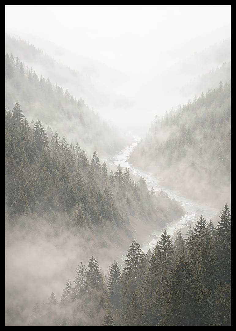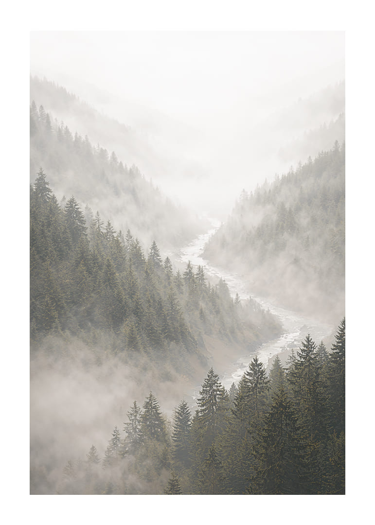Cette affiche capture une vue majestueuse de la verdure de la forêt, où la brume enveloppe doucement les sommets majestueux des montagnes. Les arbres se dessinent indistinctement à travers la brume, créant une atmosphère de mystère et de sérénité. La palette apaisante de verts et de gris s'harmonise parfaitement et évoque la tranquillité de la nature. Idéale pour le salon, cette affiche offre une parenthèse de paix au quotidien.