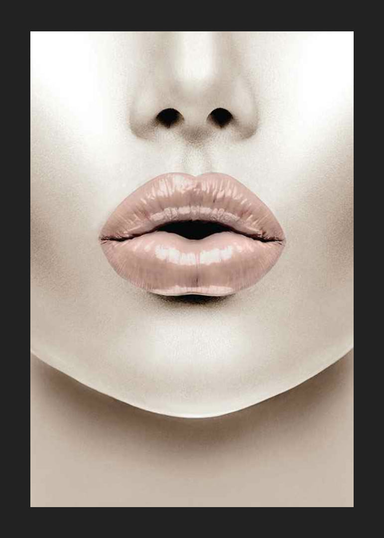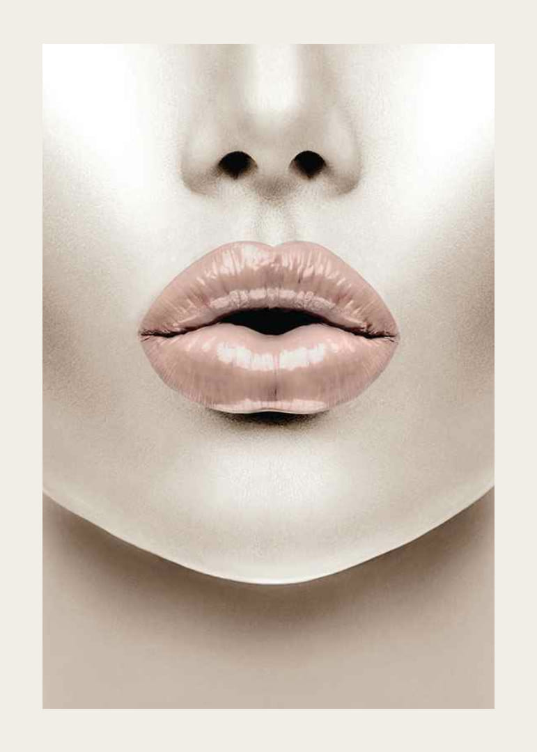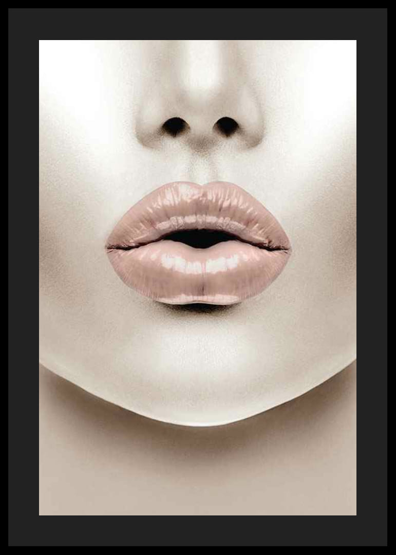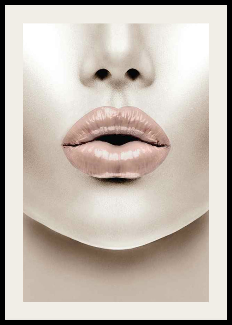 Gros plan d'un visage avec des lèvres charnues, dans une teinte rose clair au fini brillant. Les tons chair sont neutres et l'arrière-plan épuré, créant une expression moderne et graphique. Cette affiche apporte une touche d'inspiration mode et est parfaite pour une chambre ou un dressing, par exemple.