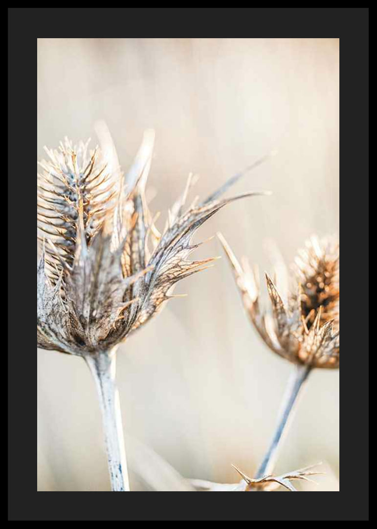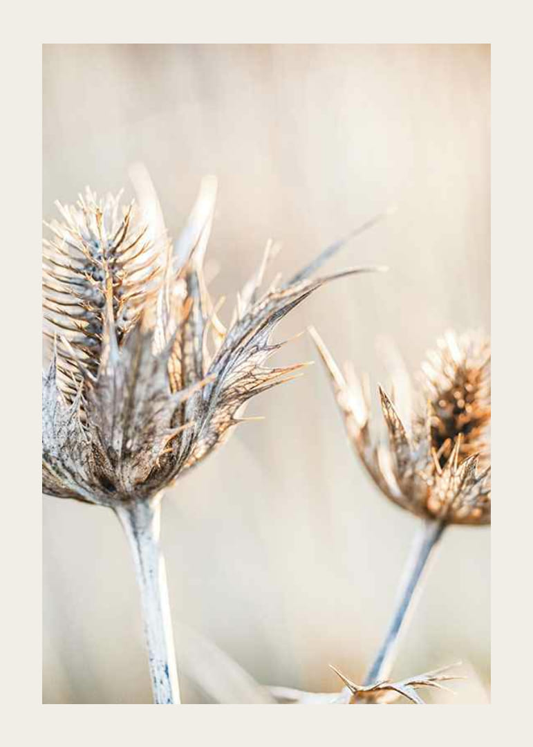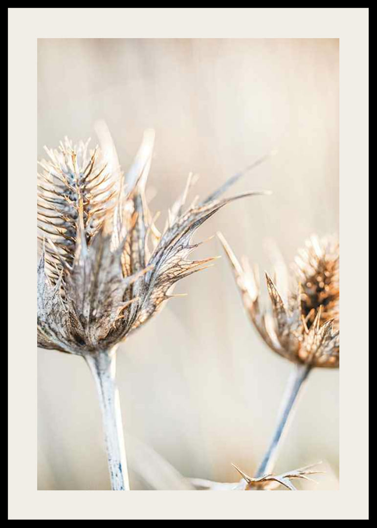 Gros plan de deux chardons séchés aux feuilles et tiges hérissées sur un fond beige clair flou. Les détails de la structure des plantes sont mis en valeur par une lumière douce et naturelle. Cette affiche dégage une atmosphère paisible et naturelle et s'intègre parfaitement à tous les styles, des couloirs aux salons.