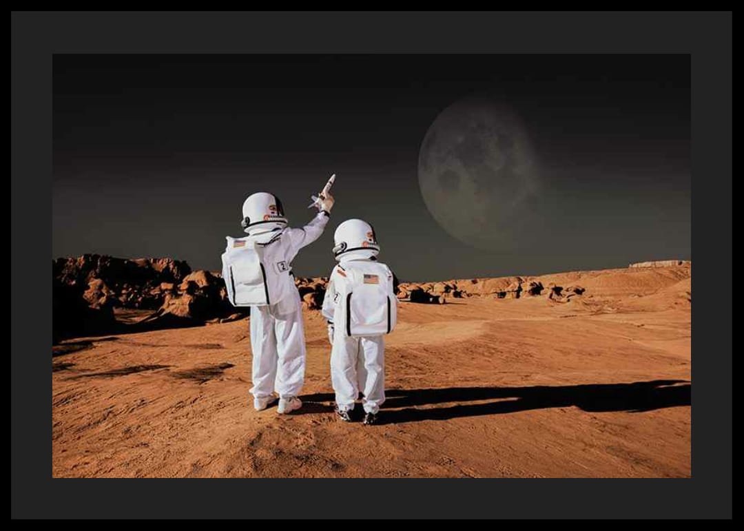 Deux enfants en combinaisons d'astronautes blanches se tiennent côte à côte dans un paysage désertique rouge rappelant Mars, avec un ciel sombre et une grande lune en arrière-plan. Les enfants regardent vers l'espace, l'un d'eux pointant vers le ciel. Cette affiche allie le thème de l'espace à un esprit de découverte et sera parfaite dans une chambre d'enfant ou une salle de jeux.