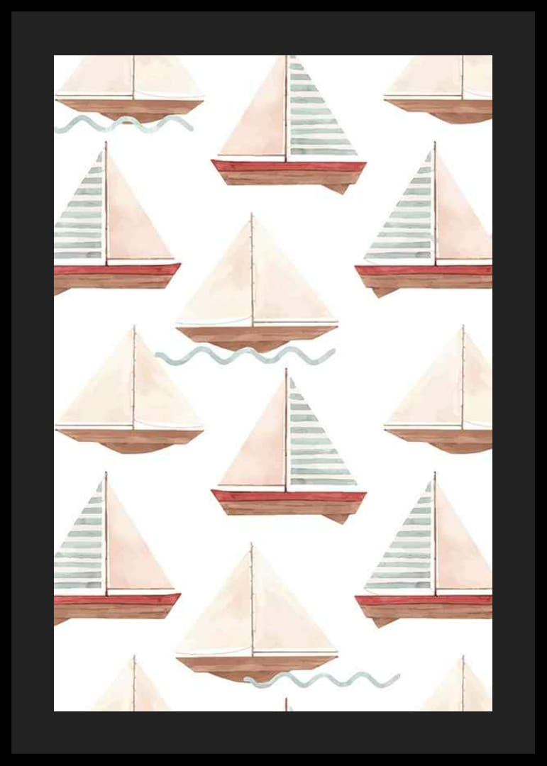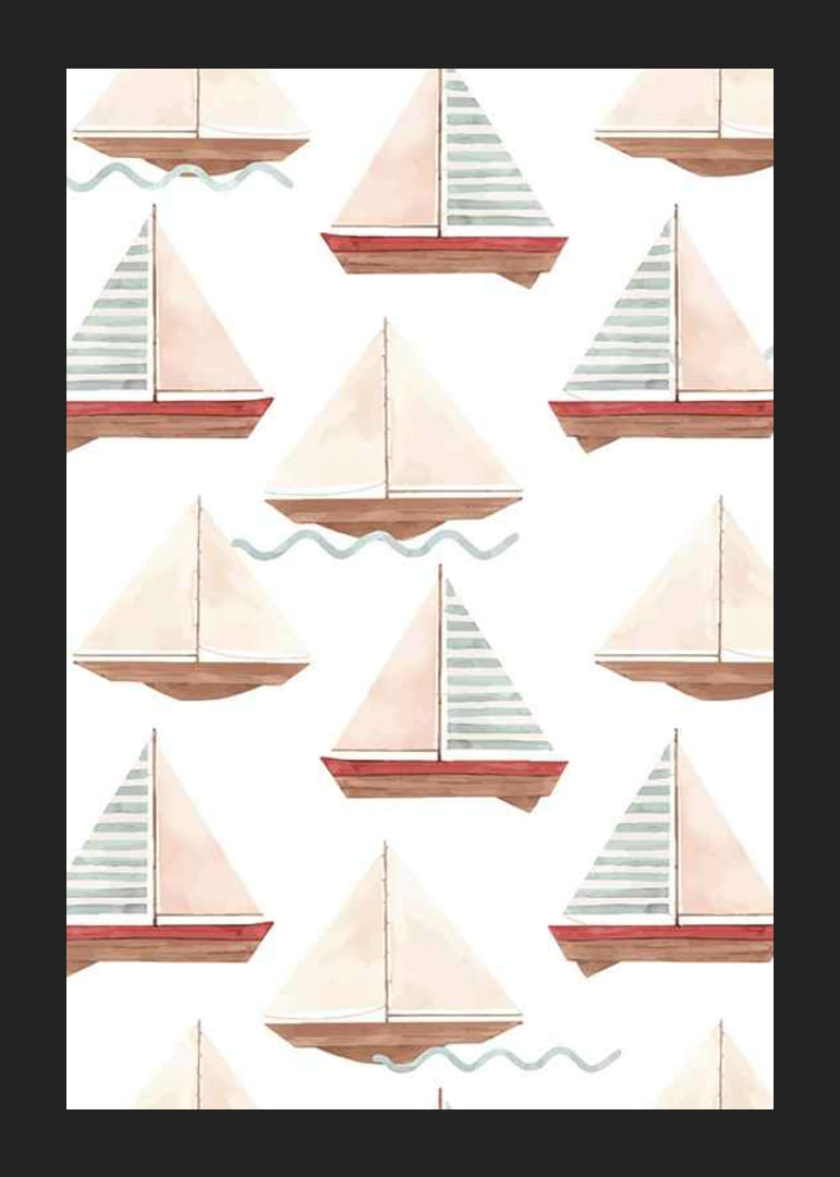 Le motif se compose de voiliers peints à la main dans des tons rose, beige et gris-bleu, disposés en un motif répétitif sur un fond blanc. Certains bateaux arborent des voiles rayées, créant ainsi une variation dans l'ensemble. Son côté ludique en fait un poster idéal pour les chambres d'enfants ou les aires de jeux où une ambiance légère est recherchée.