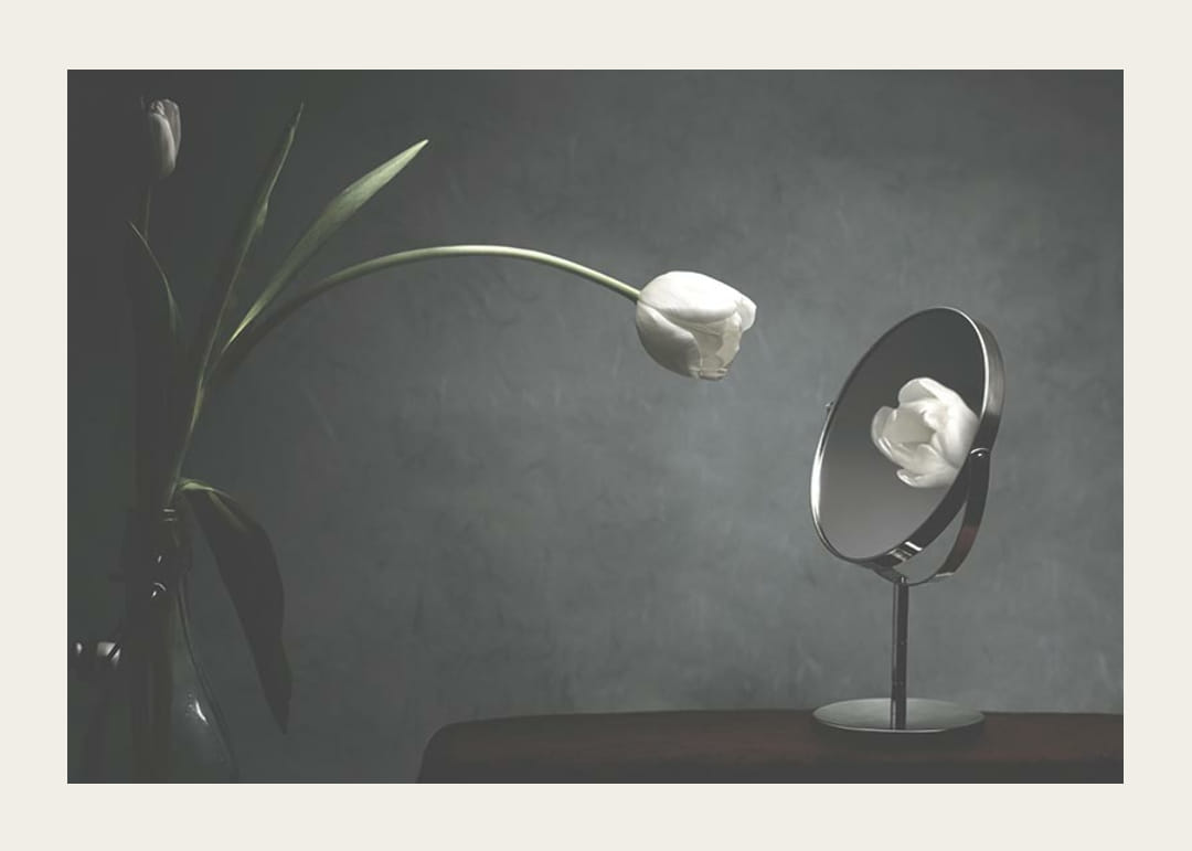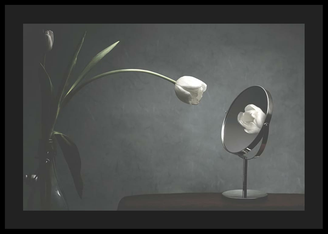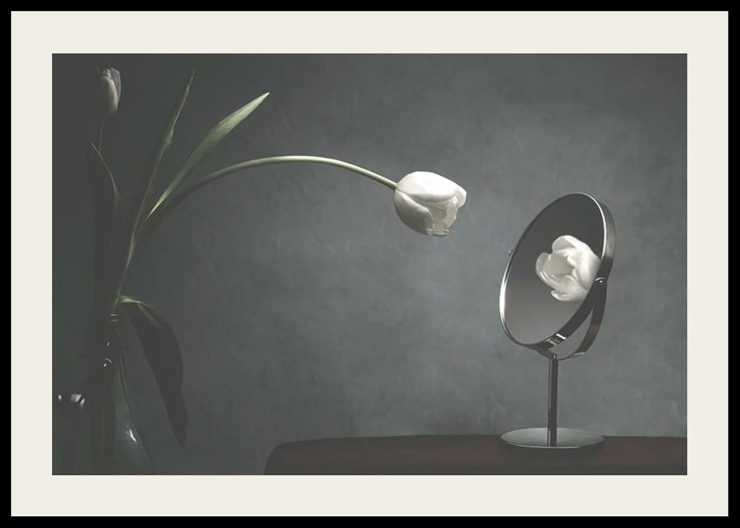 Une tulipe blanche à longues tiges se penche sur une table et se reflète clairement dans un miroir rond. Un éclairage doux et tamisé confère au motif une atmosphère paisible et légèrement surréaliste sur un fond gris. Cette affiche apportera une touche subtile et réfléchie à un salon, une chambre ou un bureau.