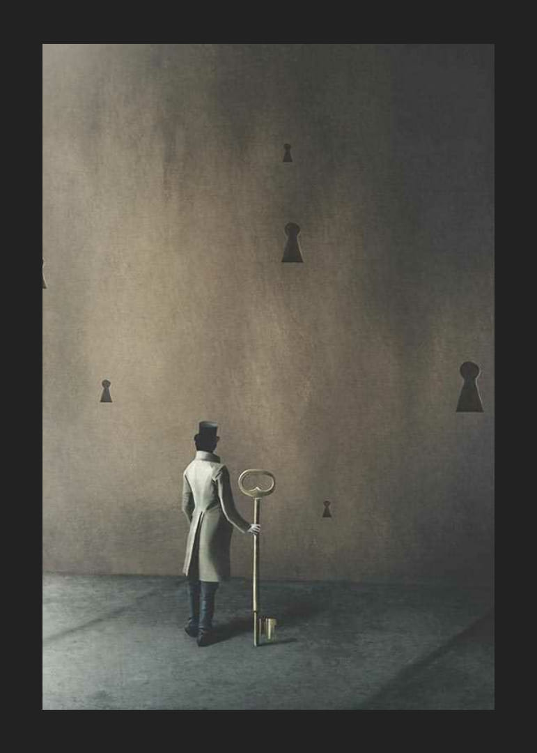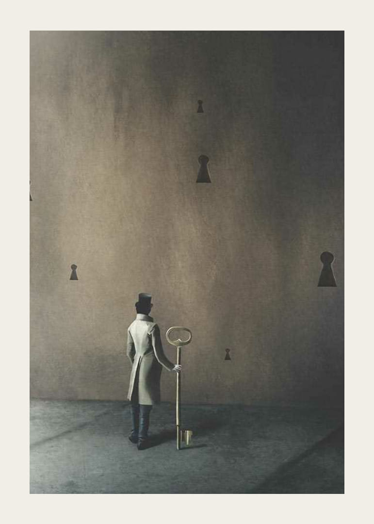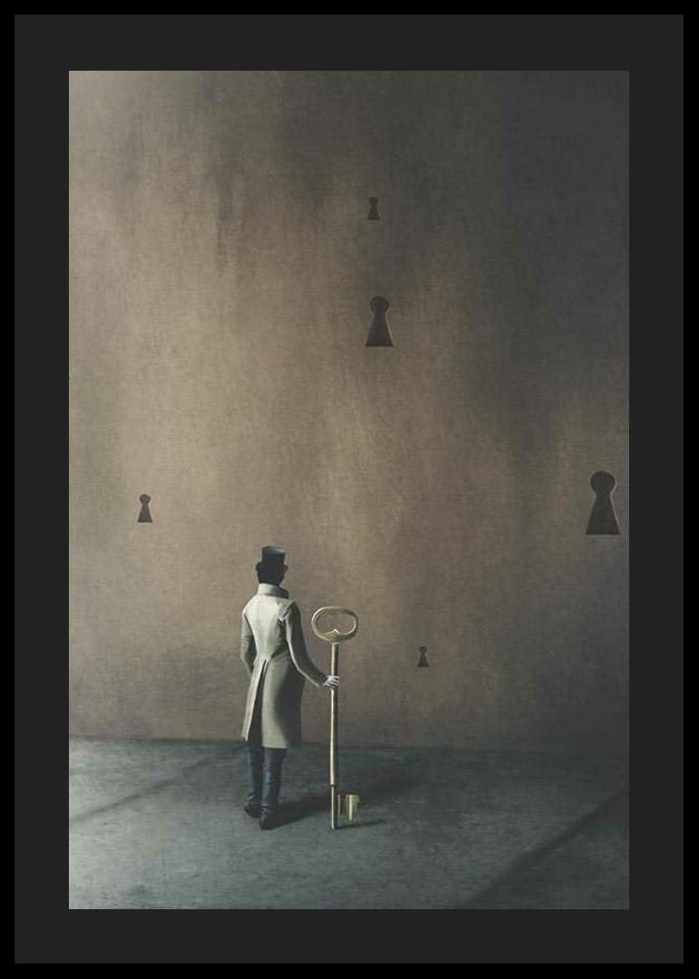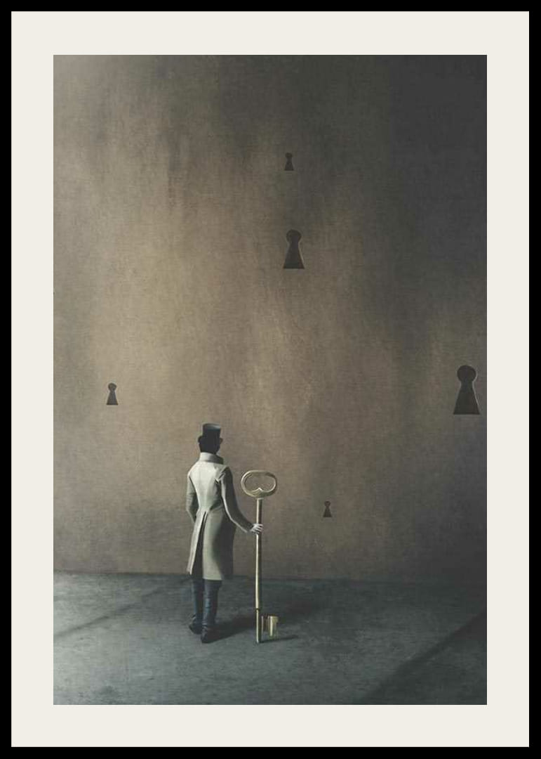 Un homme vêtu d'un long manteau et d'un haut-de-forme se tient debout face à un grand mur marron, ponctué de plusieurs trous de serrure de différentes tailles. Il tient une grande clé dorée à la main et se tient seul dans une pièce faiblement éclairée. Le motif énigmatique confère à l'affiche une subtile dimension visuelle et convient aussi bien à la maison qu'au travail.