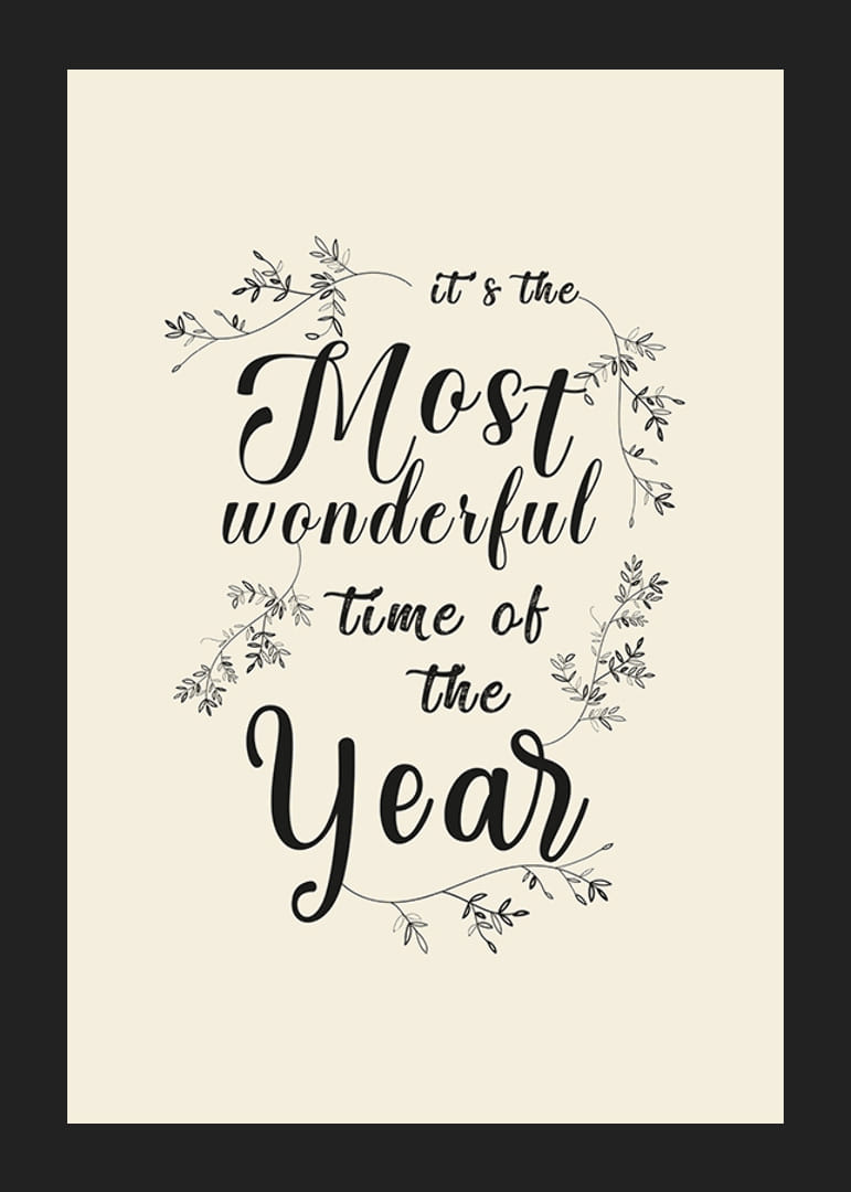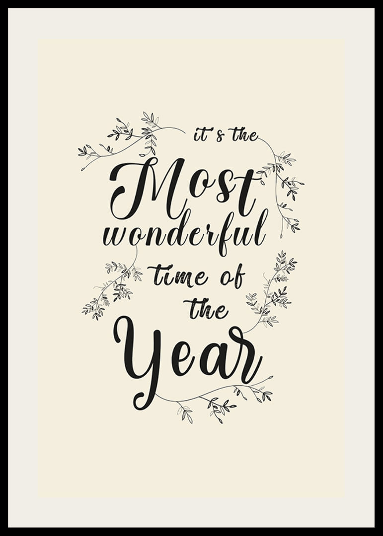 Un texte calligraphié noir avec le message « C'est la plus belle période de l'année » trône au centre, entouré de fines branches de feuilles illustrées. Le fond couleur sable apporte une touche chaleureuse et minimaliste. Cette affiche est parfaite pour un salon ou une entrée en hiver et crée une subtile ambiance de Noël.