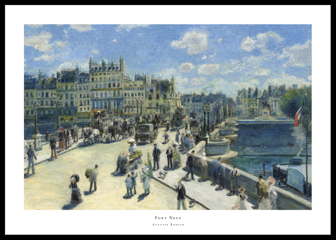Affiche avec le tableau Pont Neuf du peintre et illustrateur français Auguste Renoir de 1872. Auguste Renoir est considéré comme l'un des plus grands impressionnistes. Il est connu pour ses motifs d'enfants, de jeunes femmes, de paysages et de fleurs. Pont Neuf est, malgré son nom, le plus ancien pont survivant sur la Seine à Paris. Il a été achevé en 1607.