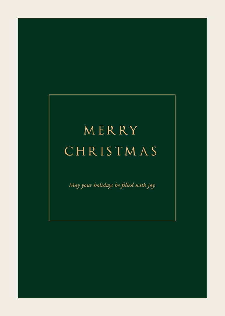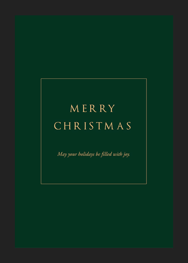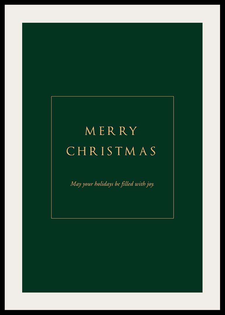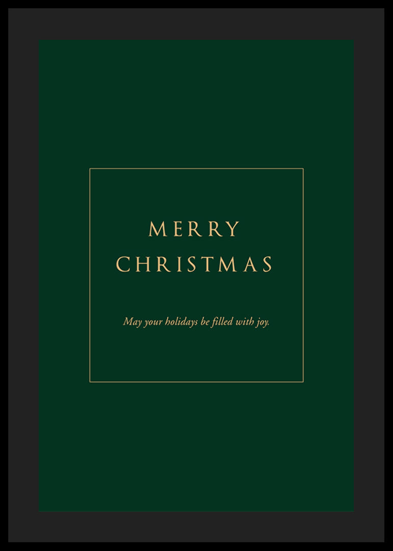 Texte centré dans des tons dorés sur fond vert foncé, avec les messages « Joyeux Noël » et « Que vos fêtes soient remplies de joie ». Son design élégant et minimaliste lui confère une expression sobre. En guise de décoration de Noël, cette affiche apportera une touche festive et classique à votre salon ou entrée pendant l'hiver.