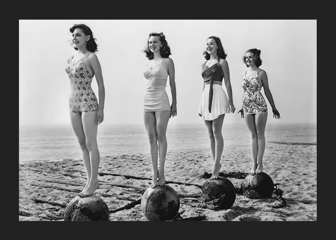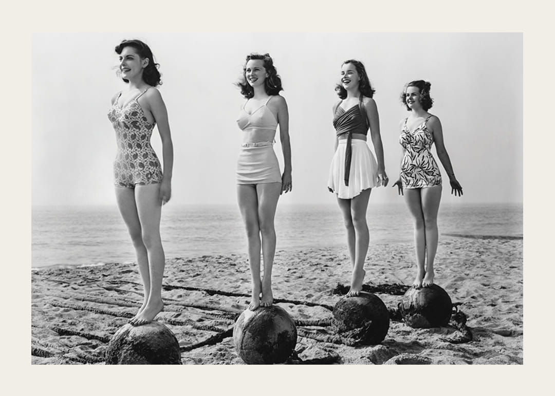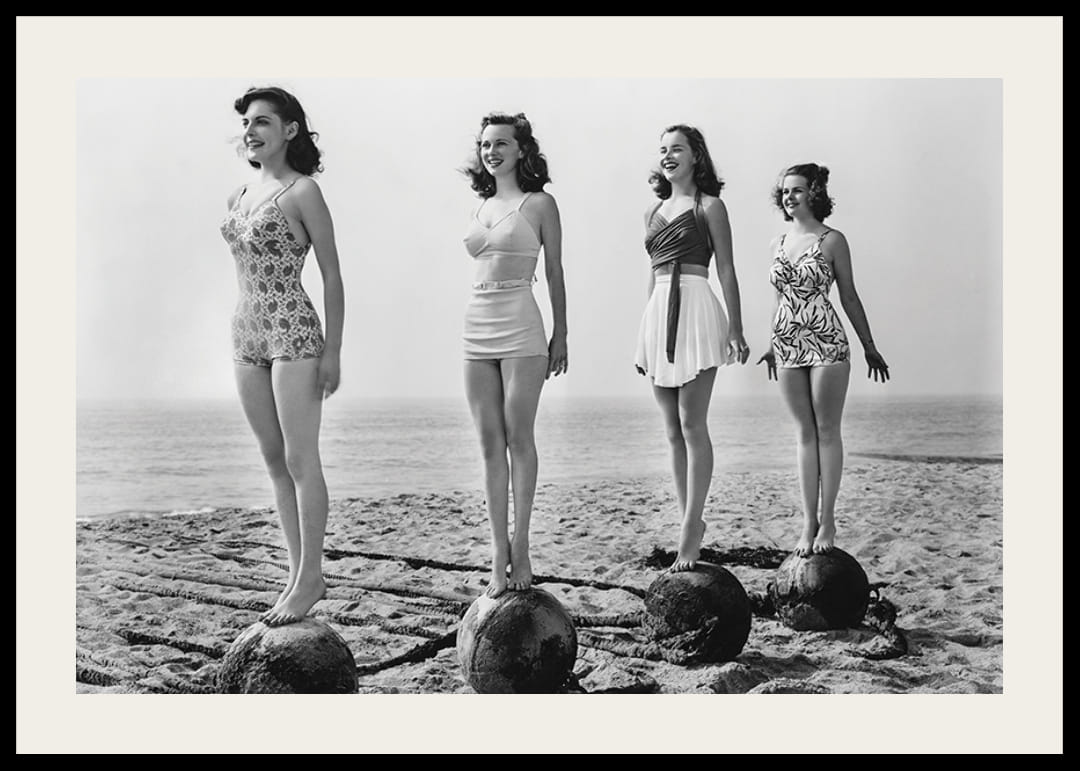 Quatre femmes en maillot de bain d'époque se tiennent en équilibre sur de gros ballons au bord de la plage, avec la mer en toile de fond. Ce personnage vintage noir et blanc évoque une atmosphère ludique et nostalgique. Une affiche qui apporte une touche rétro et la joie intemporelle de l'été à votre salon, votre entrée ou votre salle de bain.