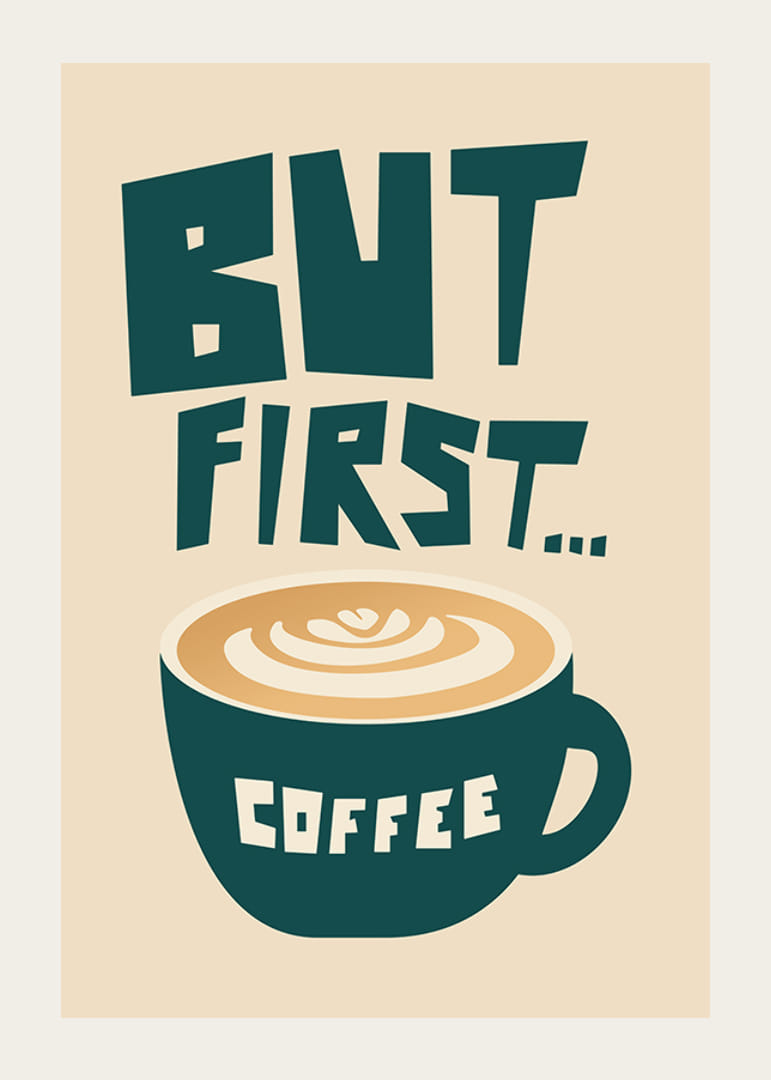 Illustration graphique représentant une tasse à café vert foncé ornée d'un latte art au centre, entourée du texte stylisé « BUT FIRST... COFFEE » sur fond beige. Le design puissant des lettres et la palette de couleurs épurée confèrent à l'affiche une touche moderne et ludique. Idéale dans la cuisine ou le coin café, elle apportera une touche d'énergie au quotidien.