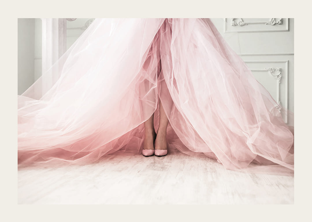 De douces couches de tulle aux tons rose pâle recouvrent un parquet clair, laissant apparaître les jambes d'une femme chaussée de chaussures assorties sous une robe ample. Des panneaux muraux classiques créent une toile de fond élégante. Cette affiche confère à la pièce une touche moderne et tendance et convient particulièrement à une chambre ou un dressing.