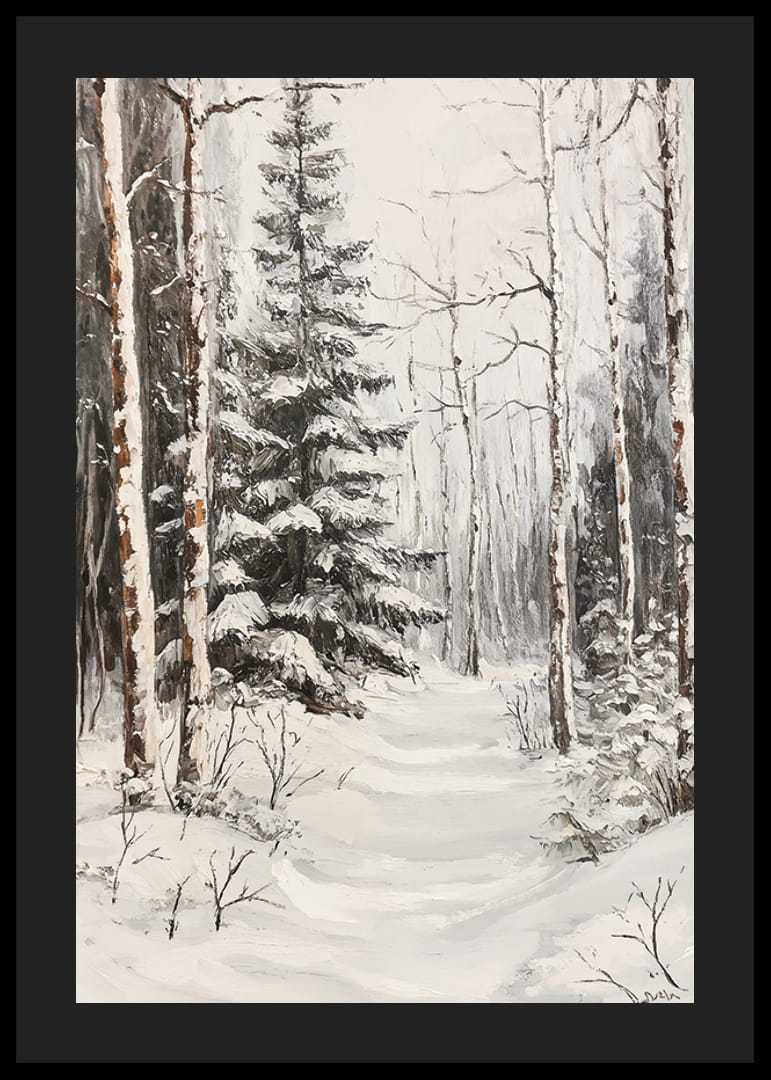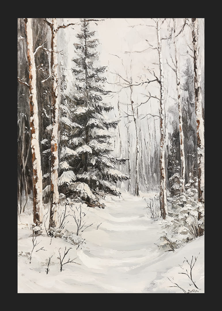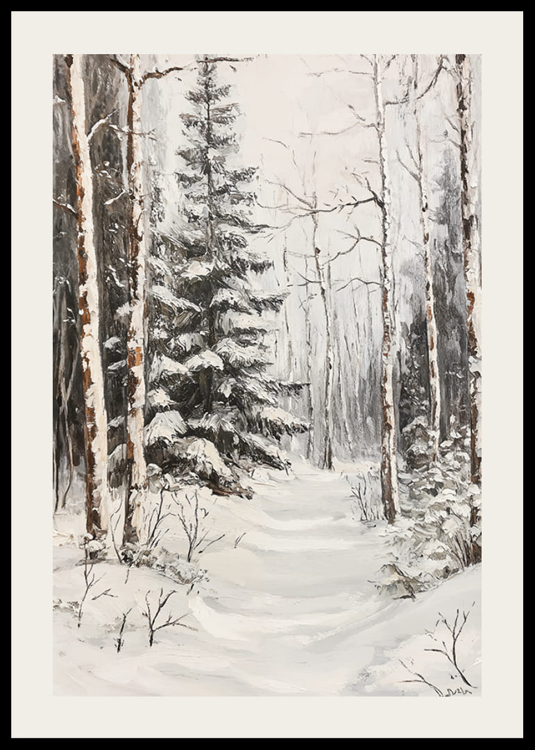 Des sapins enneigés côtoient de fins bouleaux le long d'un chemin hivernal sinueux. Des nuances douces de gris et de blanc dominent le motif, évoquant la tranquillité d'une forêt hivernale. Avec cette affiche, créez une ambiance naturelle et fraîche dans votre salon, votre couloir ou votre chambre.