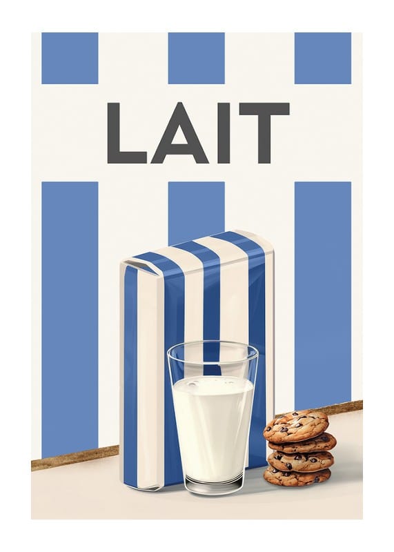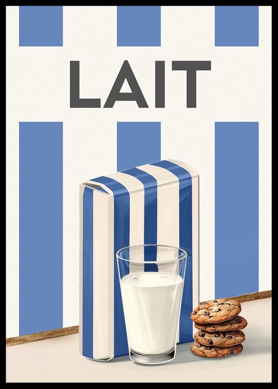 Découvrez la simplicité scandinave et le charme rétro avec cette affiche élégante représentant une aquarelle de lait. Cette illustration capture l'intemporalité d'un verre de lait froid, servi avec des biscuits aux pépites de chocolat, à côté d'un carton de lait décoré de rayures bleues et blanches classiques. Le design minimaliste et la palette de couleurs harmonieuse font de cette affiche un détail parfait dans la cuisine ou la salle à manger. Un hommage aux plaisirs quotidiens, qui transmet le sentiment de convivialité et de bons moments.