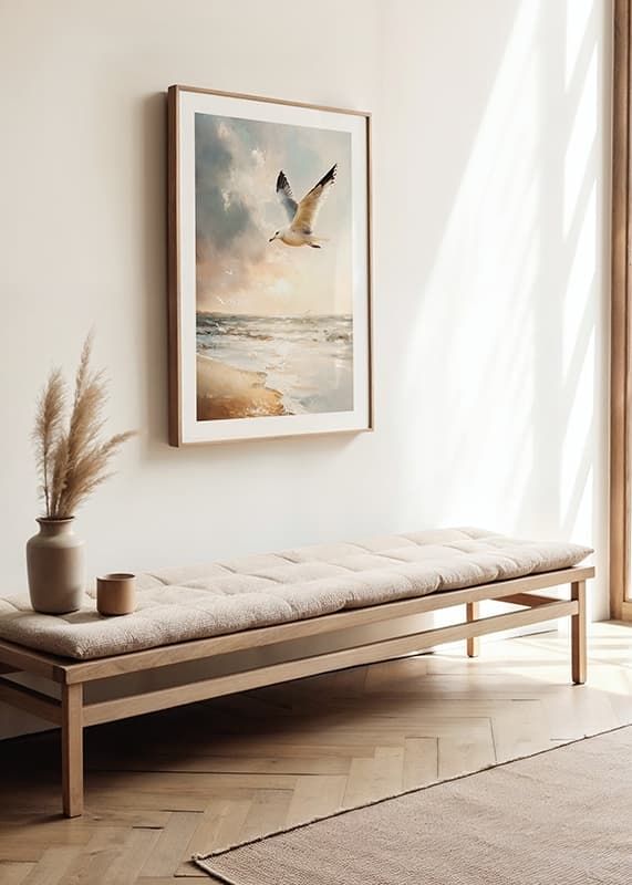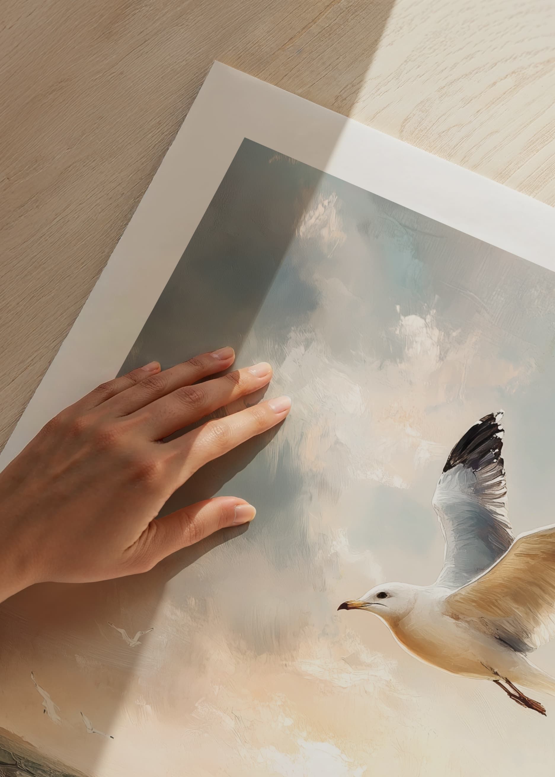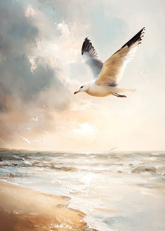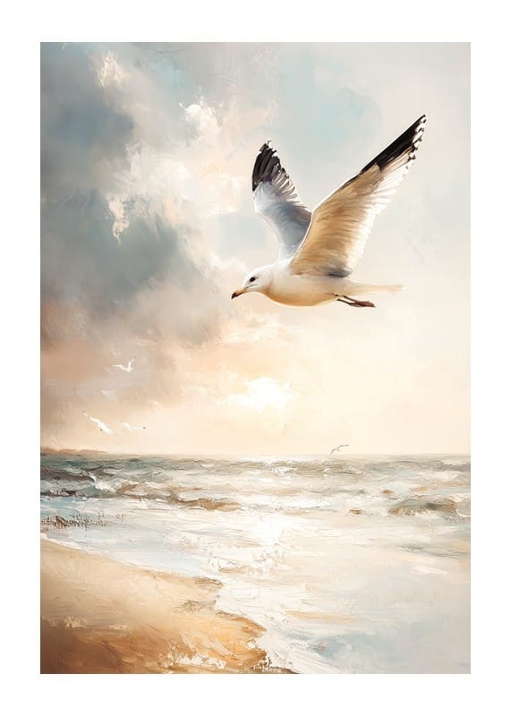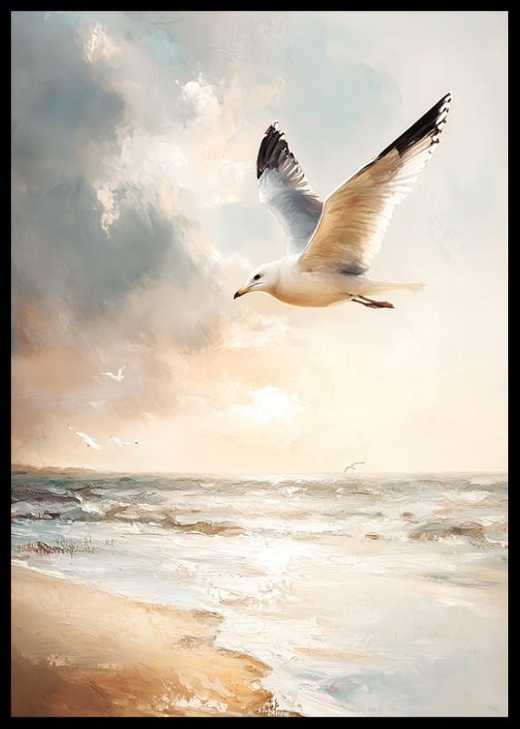 Laissez votre intérieur respirer paix et harmonie avec cette affiche de rêve. Une mouette plane librement au-dessus d'une mer étincelante dans la chaude lumière du coucher de soleil. Les coups de pinceau doux et la palette de couleurs harmonieuses créent une sensation de liberté et de tranquillité.