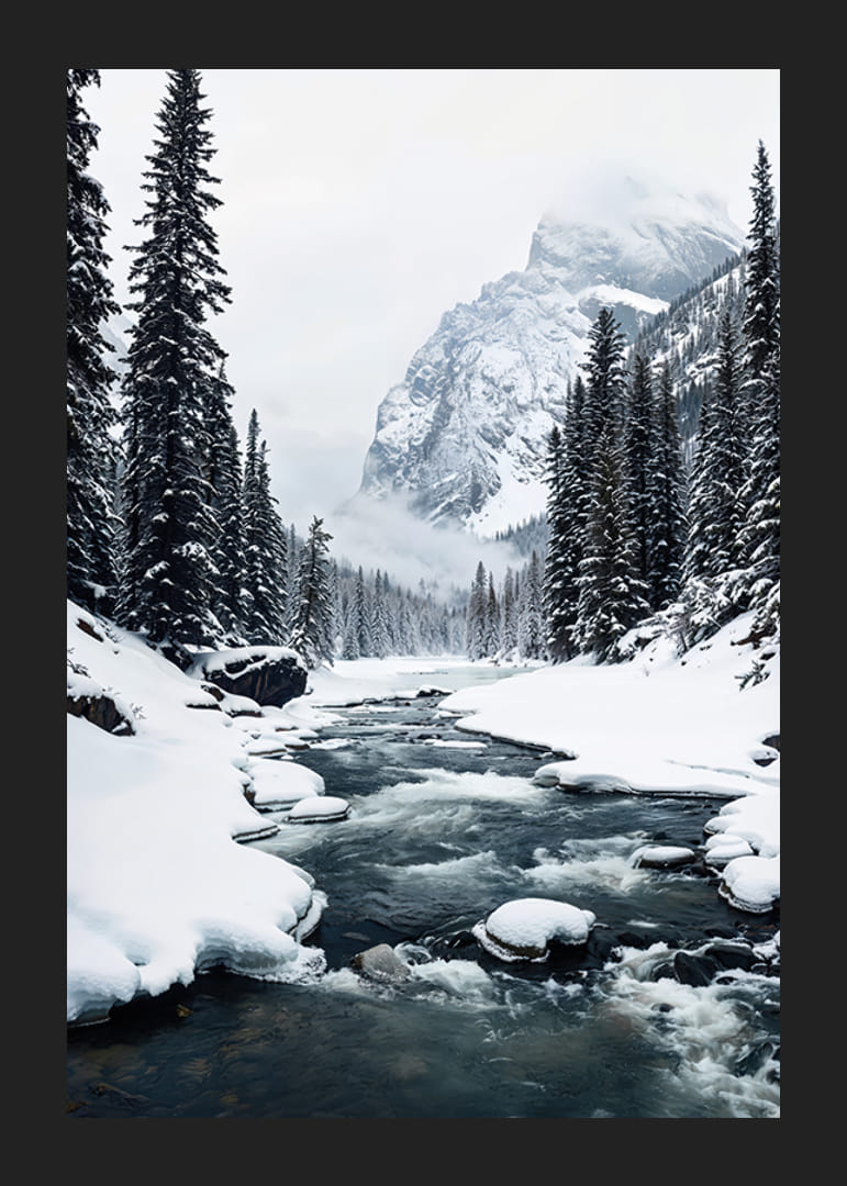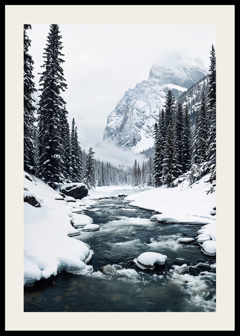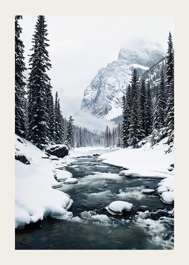 Admirez la magnificence de la nature avec cette affiche qui capture un paysage hivernal où une rivière tranquille serpente à travers des forêts enneigées, entourées de montagnes majestueuses. Parfait pour ceux qui souhaitent créer un sentiment de tranquillité et la beauté de la nature sauvage dans votre maison. L'image transmet la puissance tranquille et le calme de l'hiver, un rappel du charme éternel de la nature et des joyaux cachés du paysage nordique.