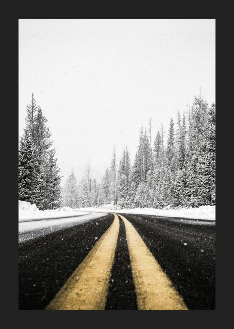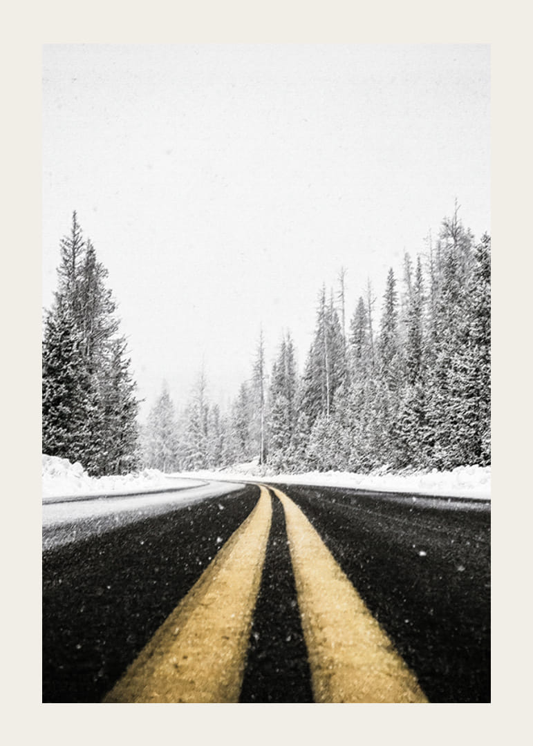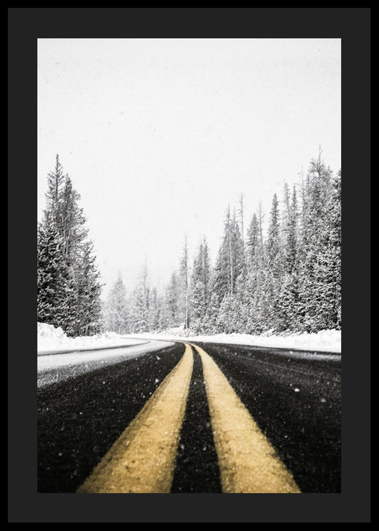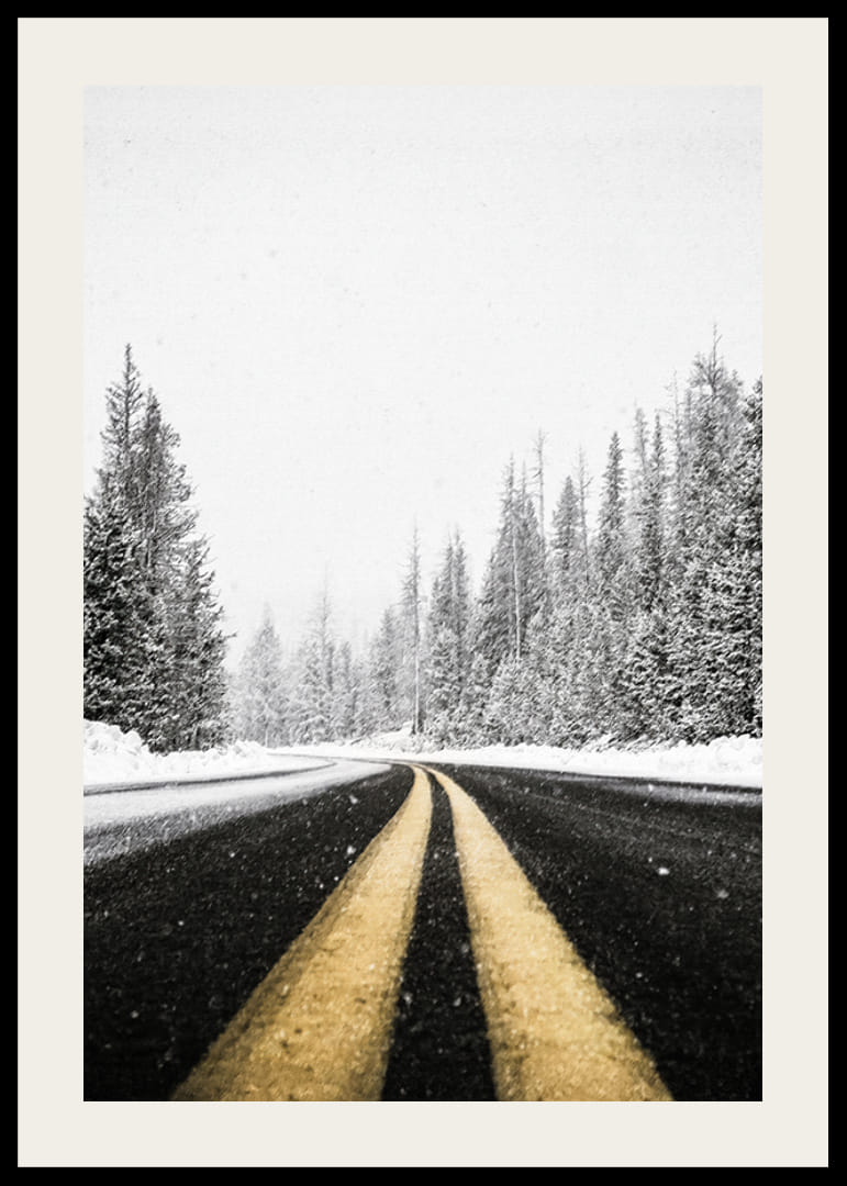 Apportez le sentiment de l’aventure hivernale avec cette affiche atmosphérique. L’image montre une route désolée s’étendant à travers une forêt enneigée, avec des arbres givrés bordant le chemin et des flocons de neige qui tombent encore. Parfait pour ceux qui aiment la magie de l’hiver et recherchent un rappel des moments calmes et paisibles de la nature. Un voyage visuel à travers le silence et le paysage hivernal, rempli de possibilités et de tranquillité.