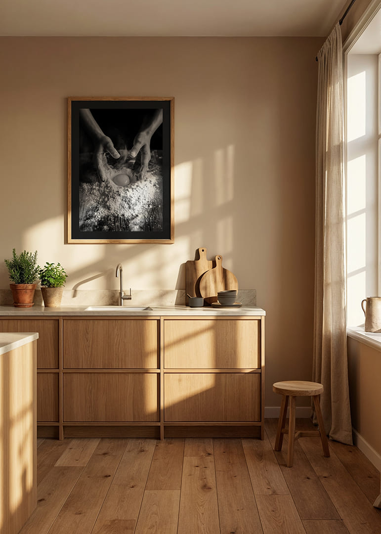 Capturez l'essence de l'artisanat de la pâtisserie avec cette affiche atmosphérique en noir et blanc. La photo montre des mains façonnant délicatement une pâte avec un œuf, encadré de farine. Un hommage à la magie de la cuisine et à la transformation d'ingrédients simples en quelque chose de grand. Parfait pour créer une sensation de chaleur et de tradition dans votre cuisine, et pour rappeler la joie de créer à partir de zéro.