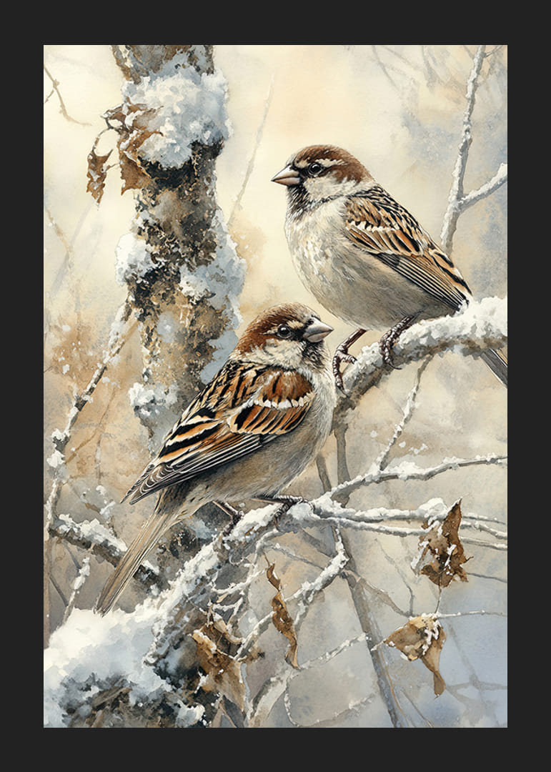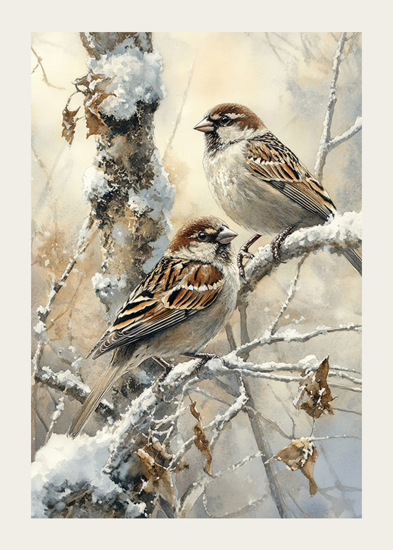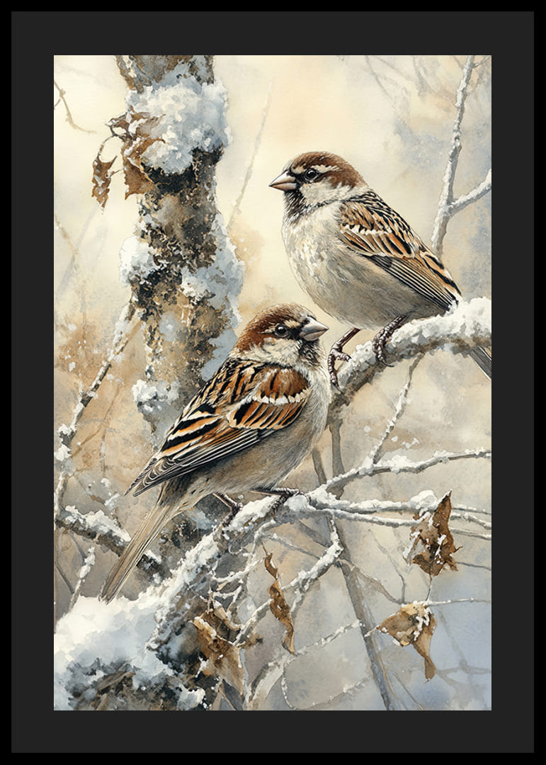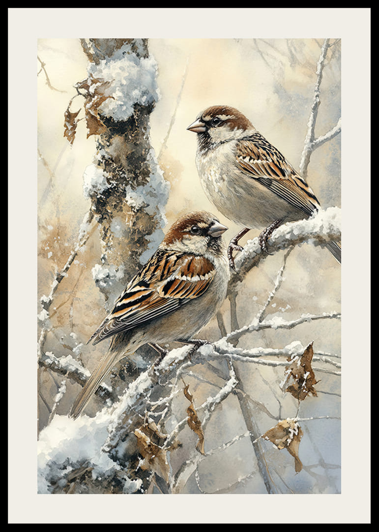 Cette affiche capture la tranquillité de l'hiver avec deux moineaux perchés sur une branche enneigée dans un paysage glacial. L'image rayonne la beauté simple et la tranquillité de la nature, parfaite pour créer une atmosphère paisible dans la maison. Que cette image rappelle le charme paisible de l'hiver et la présence fidèle des oiseaux, même pendant les mois froids - une décoration intemporelle qui transmet chaleur et harmonie.