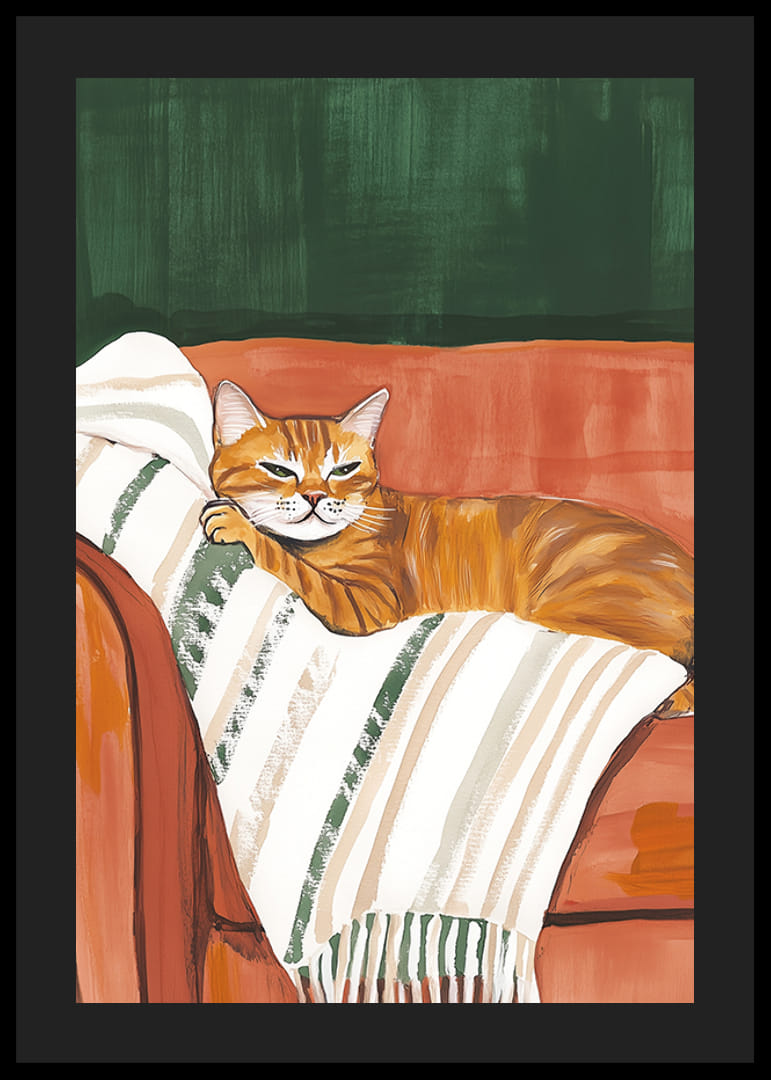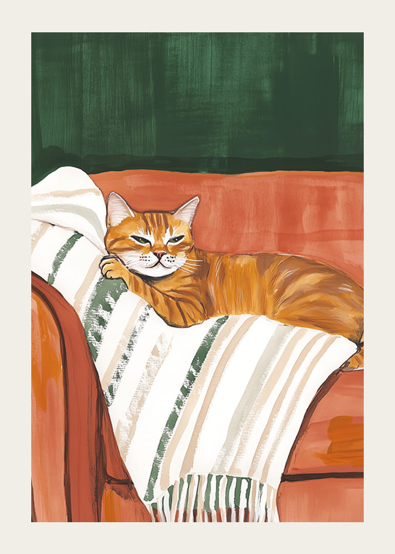 Une charmante affiche qui capture un chat orange confiant se reposant confortablement sur une couverture rayée dans un fauteuil rouge rouille chaleureux. Les tons terreux de vert, d'orange et de beige créent une atmosphère accueillante et chaleureuse.