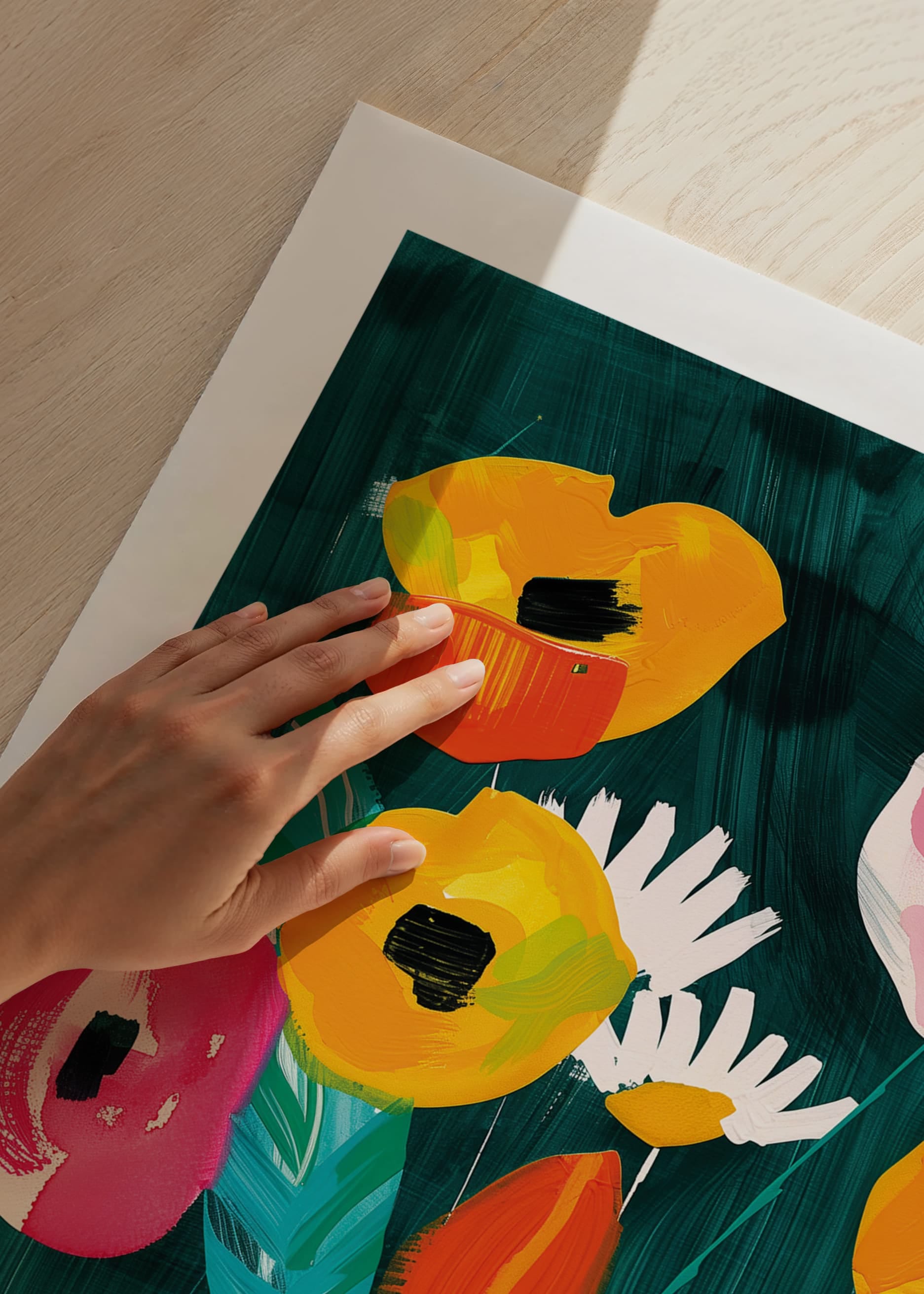 Cette affiche vibrante montre un bouquet coloré de fleurs dans des tons de jaune, rose, rouge et orange, disposé dans un vase blanc à rayures noires sur un fond vert foncé. Les contrastes forts et les formes ludiques créent une atmosphère moderne et énergique.