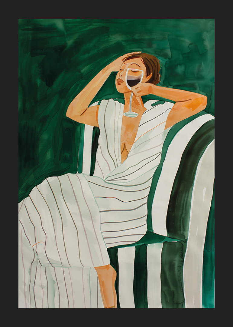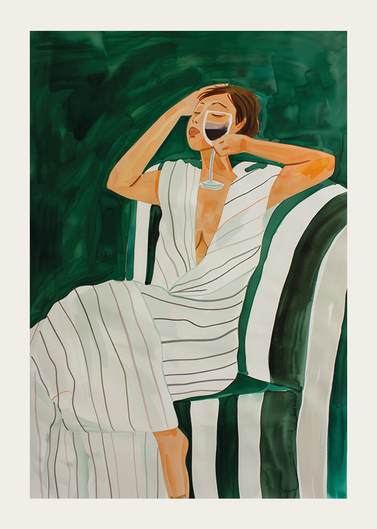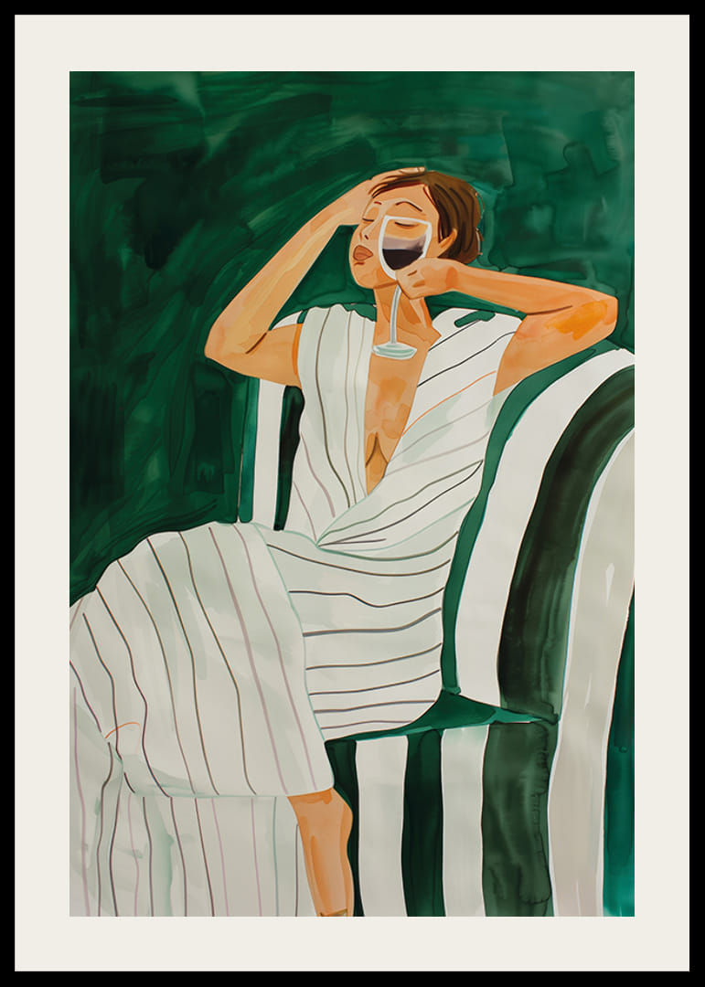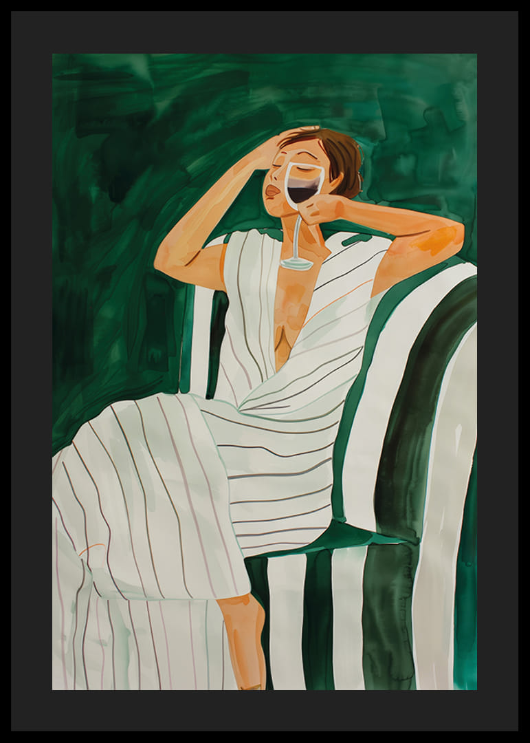 Cette illustration sophistiquée capture un moment de plaisir et de tranquillité. Une femme est assise détendue dans un fauteuil rayé, vêtue d'une robe fluide, avec un verre de vin à la main. Les tons verts profonds et les coups de pinceau doux créent une sensation d'élégance et de luxe décontracté.