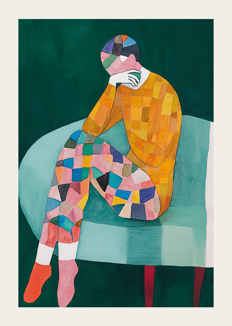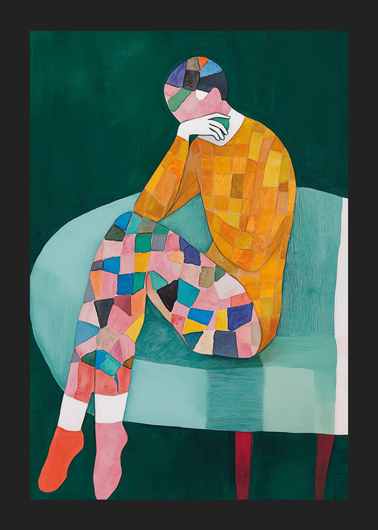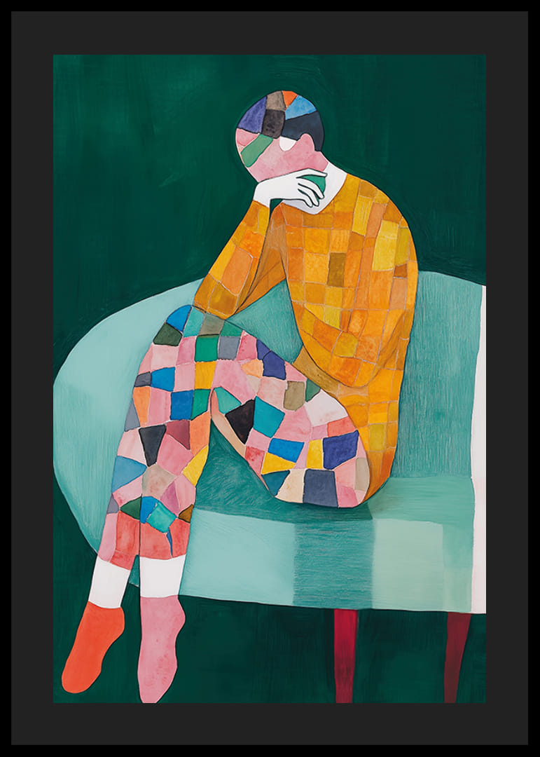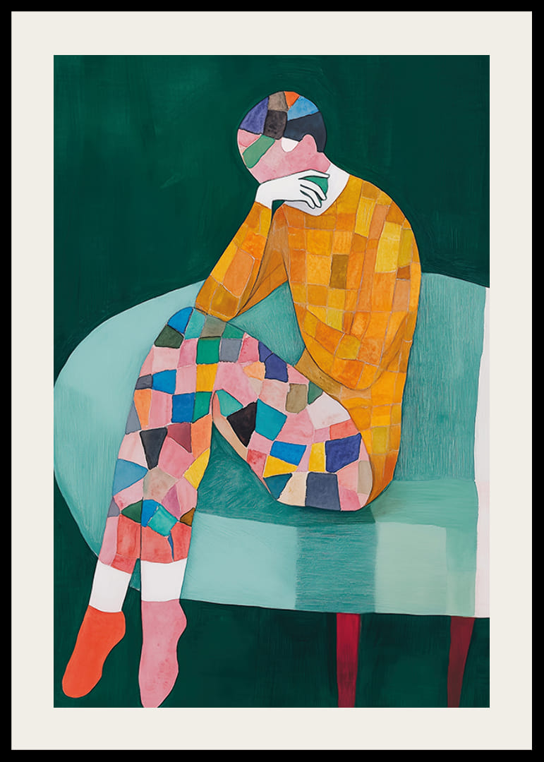 Colorée et stimulante, cette affiche capture un monde d’émotion et de créativité. Avec une expression abstraite d'une figure assise, remplie de motifs de mosaïque dynamiques, elle invite à la réflexion et à la fascination.