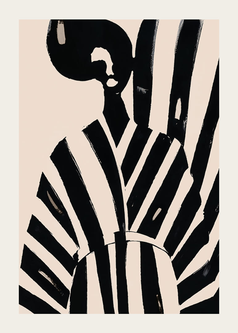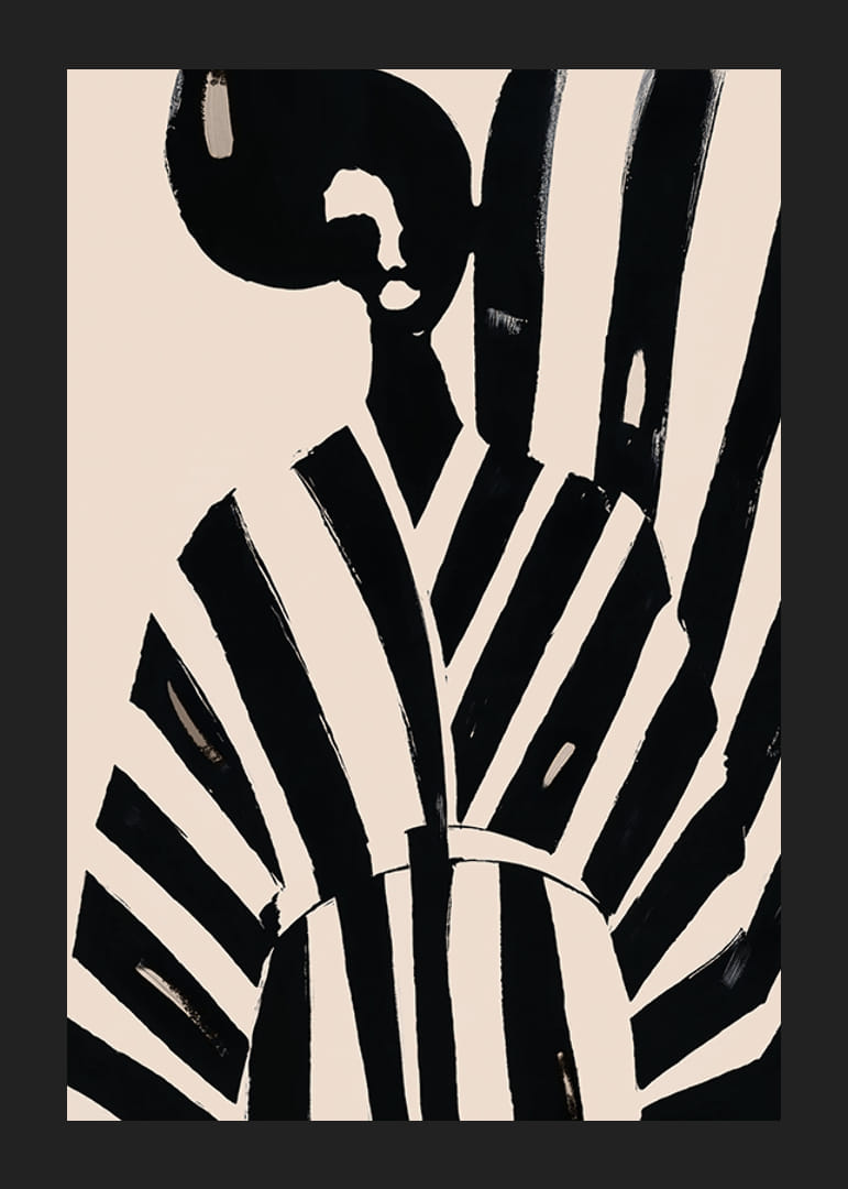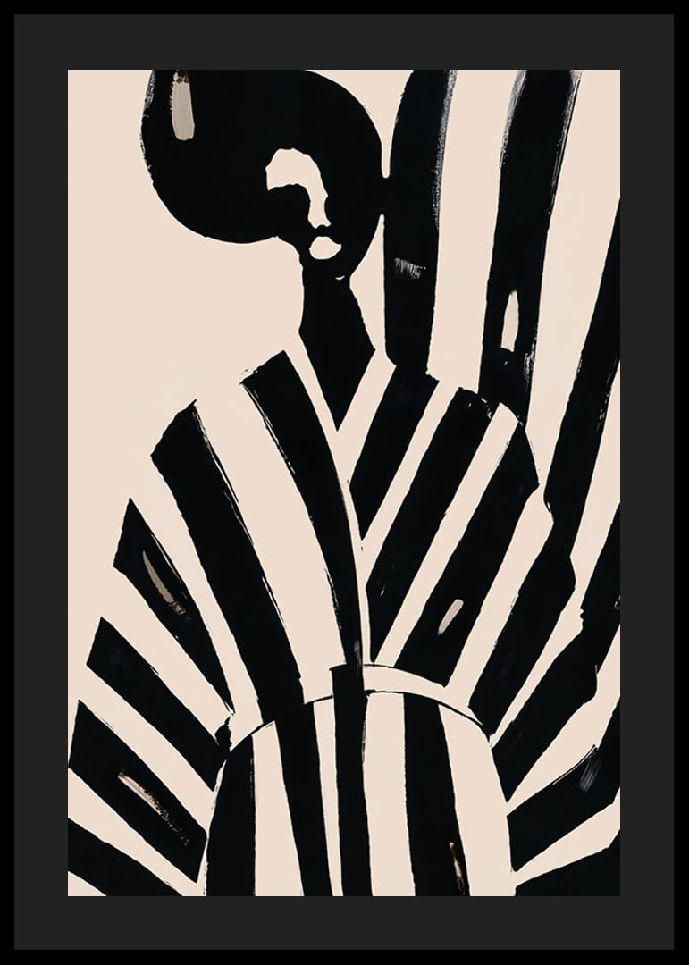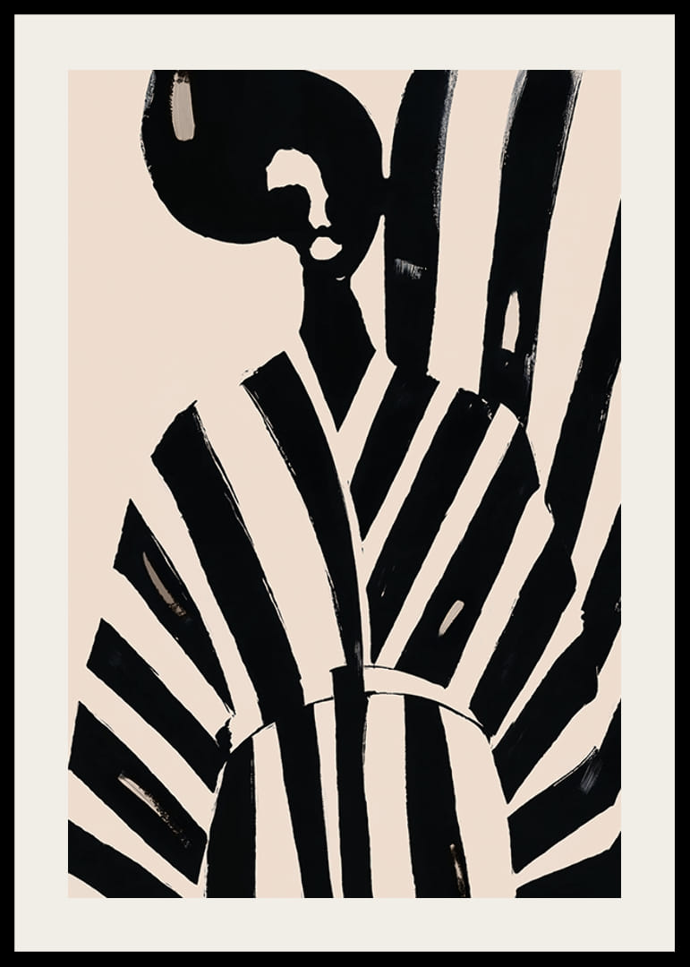 Cette affiche attire le regard avec ses puissantes rayures noires et blanches qui traversent l'image, lui donnant une sensation élégante et moderne. Le design minimaliste respire la beauté et le style intemporels, ce qui en fait un détail parfait dans un salon sophistiqué.