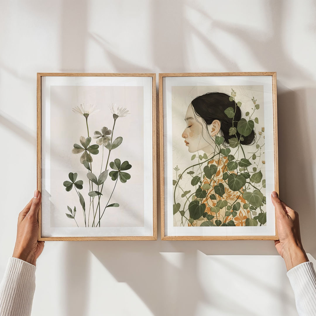 Ces affiches illustrent une magnifique symbiose entre la nature et l'humanité, avec un portrait artistique où fleurs et feuilles se fondent dans la silhouette humaine. Les couleurs douces et naturelles créent une atmosphère apaisante, transformant n'importe quelle pièce en une oasis de paix. En accrochant ces affiches, vous pouvez facilement donner à votre intérieur une touche d'élégance intemporelle et de beauté naturelle.