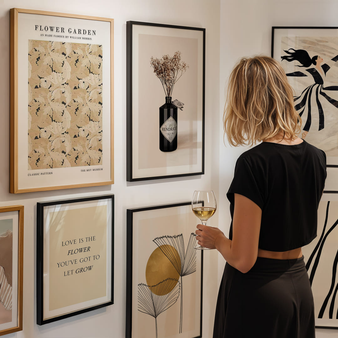 Ce mur d'art vous invite à un univers de paix et de beauté grâce à ses affiches magnifiquement composées, qui s'harmonisent parfaitement. Les subtiles teintes dorées et beiges créent une atmosphère chaleureuse et accueillante, tandis que les formes organiques et les éléments floraux évoquent une élégance intemporelle. Cette composition artistique, ornée du gin Hendricks, élève la pièce vers de nouveaux sommets de style et d'inspiration.